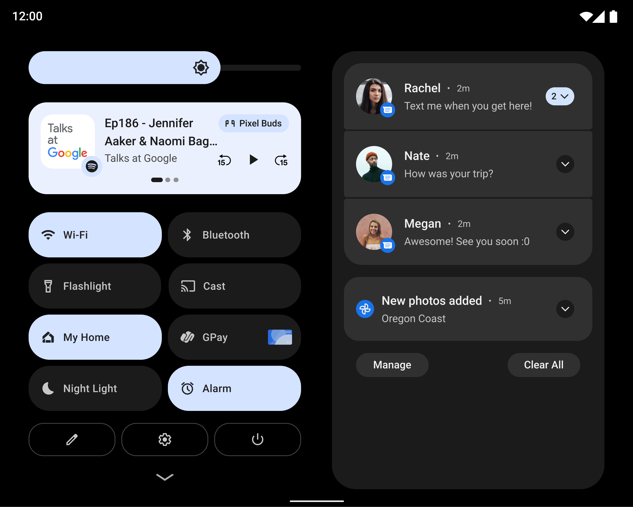 12L'de kullanıcı arayüzünü, Android'i 600 sp'den büyük ekranlarda (bildirimler, hızlı ayarlar, kilit ekranı, genel bakış, ana ekran vb.)
