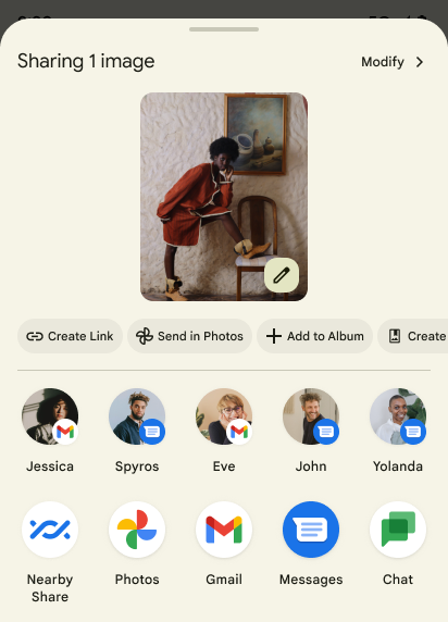 Android 14 更新了系统 Sharesheet,以便为用户提供自定义应用操作和信息更丰富的预览结果。