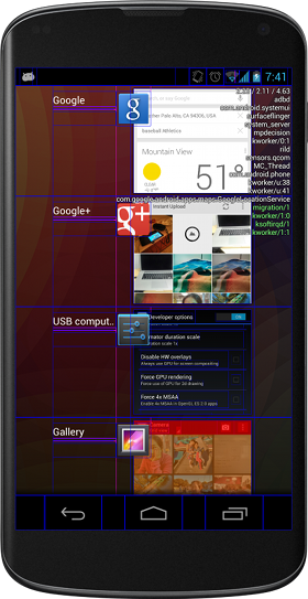 Android 4.3에서는 RTL 성능이 향상되며, ProgressBar/Spinner 및 ExpandableListView를 포함하여 프레임워크 UI 위젯 전체에서 더 광범위한 RTL을 지원합니다. uiautomatorviewer 도구를 통해 더 많은 디버깅 정보를 볼 수 있습니다. 또한 알림, 탐색 메뉴, 작업 메뉴와 같은 더 많은 시스템 UI 구성요소가 이제 RTL을 인식합니다.