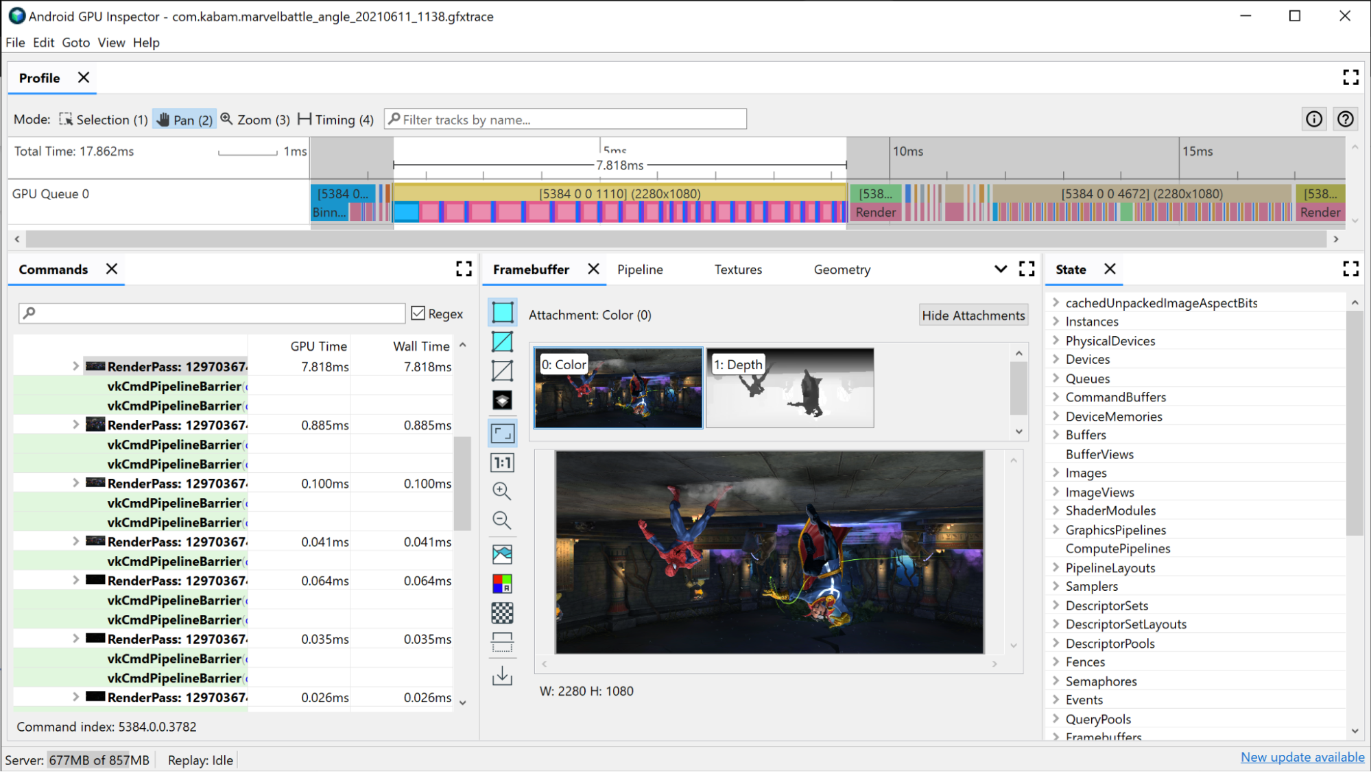 Захватите трассировку из отдельного кадра приложения, а затем выполните глубокий анализ использования GPU вашей игрой. Это включает более глубокий охват и анализ вызовов API Vulkan и OpenGL ES.