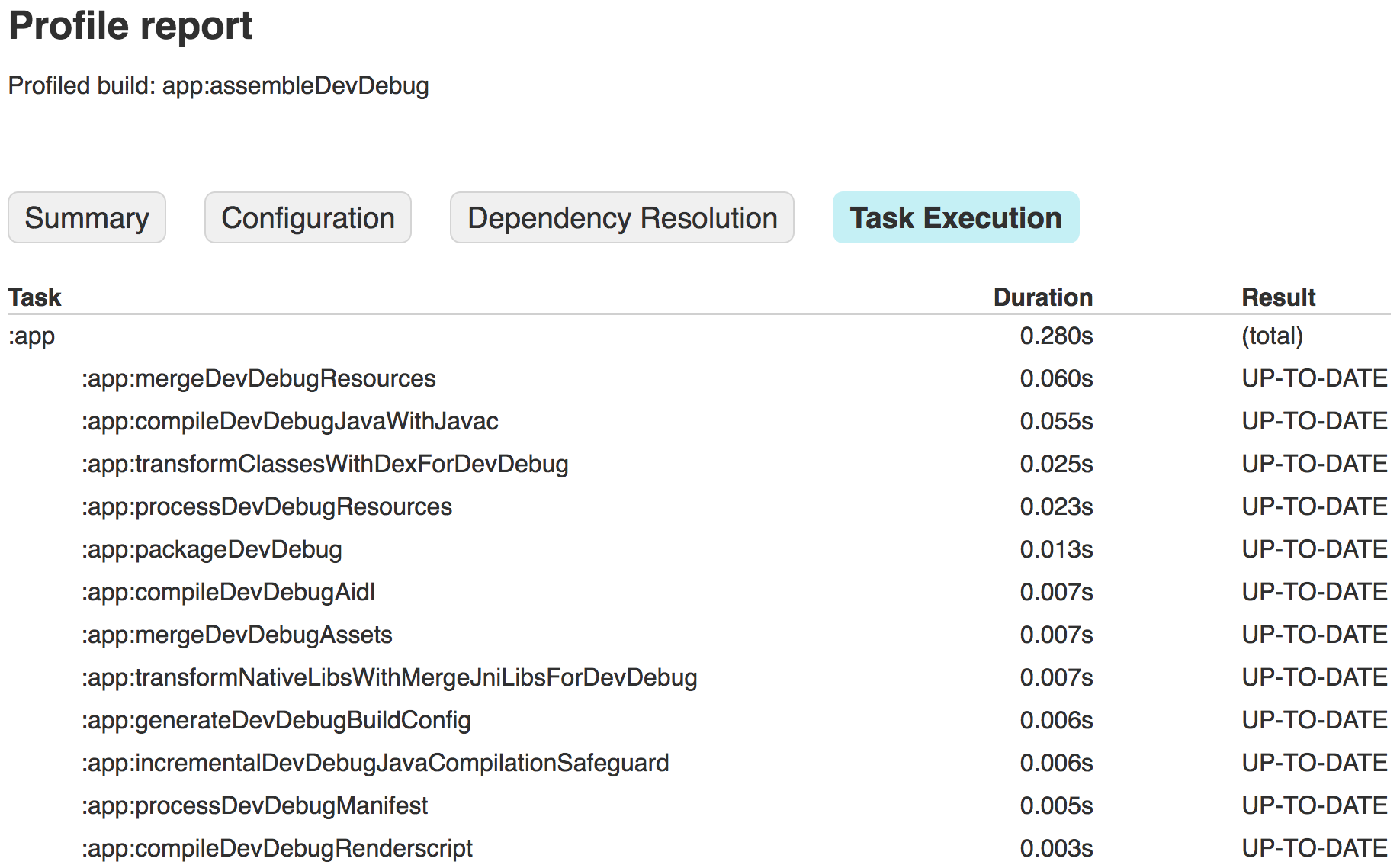 6. Optional: Before making any changes to your project or build configuration, repeat the command in step 3, but omit the --rerun-tasks flag. Because Gradle attempts to save time by not re-executing tasks whose inputs haven't changed (these are indicated as UP-TO-DATE in the Task Execution tab of the report, as shown in figure 3), you can identify which tasks are performing work when they shouldn't be. For example, if the :app:processDevUniversalDebugManifest is not marked as UP-TO-DATE, it may suggest that your build configuration is dynamically updating the manifest with every build. However, some tasks need to run during each build, such as :app:checkDevDebugManifest.