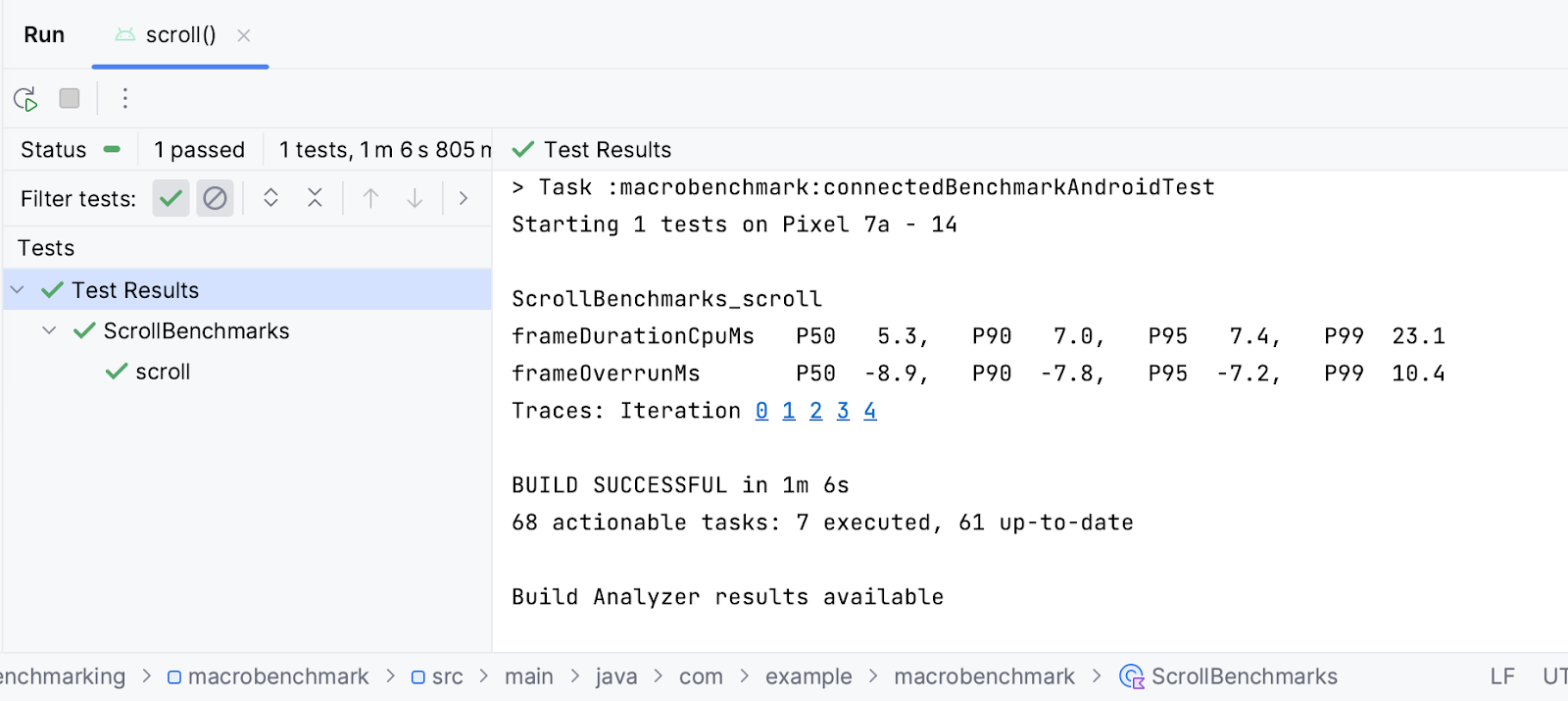 运行基准的方式与启动基准相同。点击测试旁边的边线图标,然后选择 Run 'scroll()'