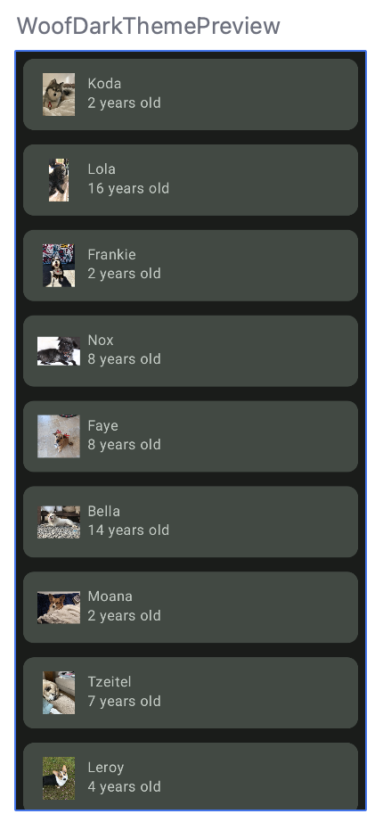 查看 WoofPreview()。添加了 WoofTheme(),以提供您在 WoofPreview() 中看到的 Material 主题设置。