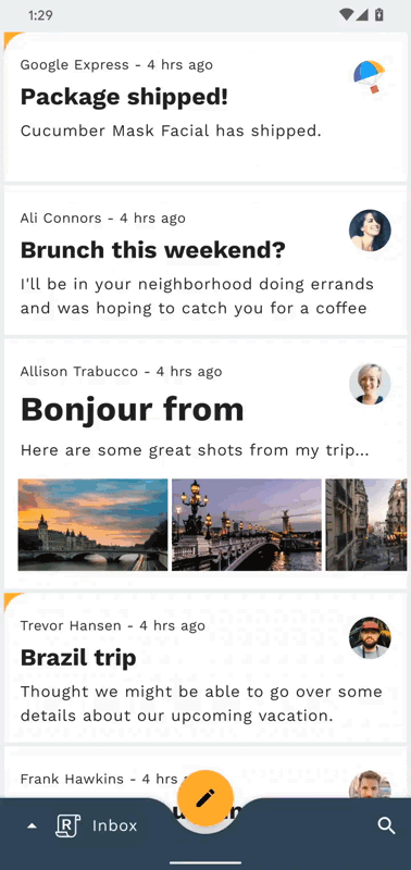 view.doOnPreDraw { startPostponedEnterTransition() }Try re-running the app. Pressing back after opening an email will collapse the email back into the list. Nice! Let's keep improving the animation.
