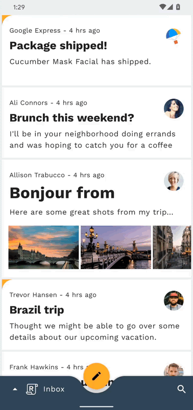 现在,再次运行该应用。您应该会看到 FAB 转换为撰写屏幕(请参阅这一步骤末尾的 GIF)。