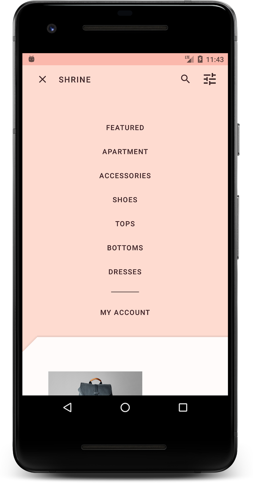 For a further challenge with this codelab, modify your Shrine application to change the product images shown when a category is selected from the backdrop menu.