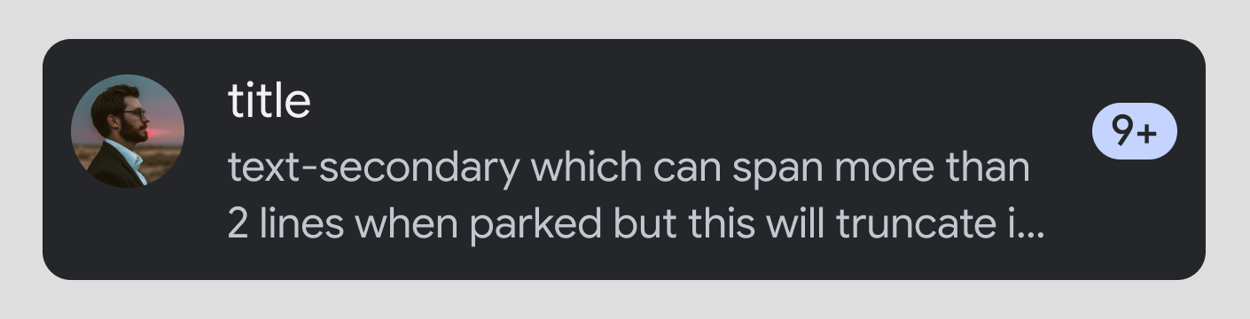 संख्यात्मक डेकोरेशन: ज़रूरी नहीं है. आम तौर पर, इसका इस्तेमाल ऐसे कॉन्टेंट की संख्या दिखाने के लिए किया जाता है जिसे देखा नहीं गया है. जैसे, बिना पढ़े मैसेज.