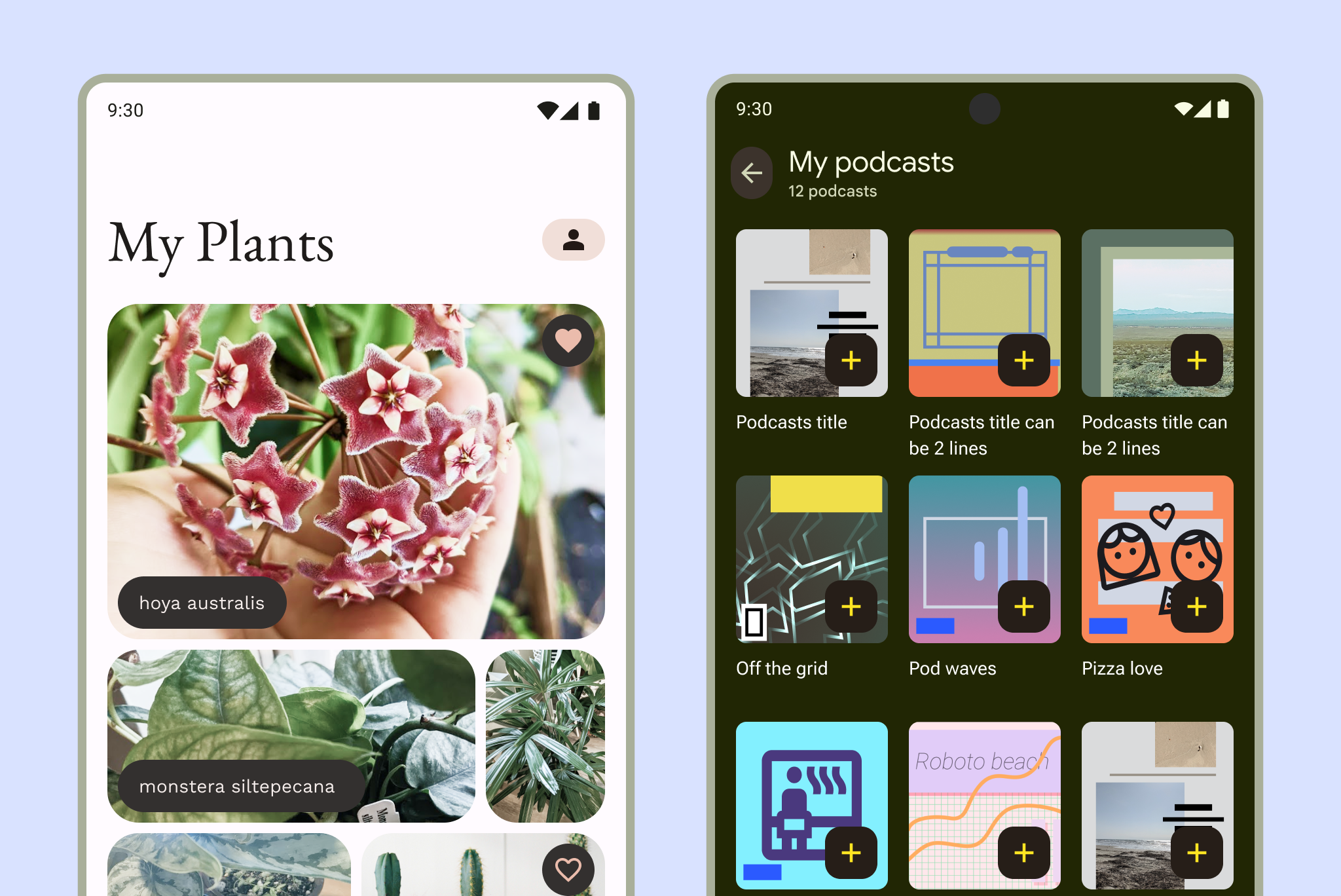 নাউ ইন অ্যান্ড্রয়েড ফিগমা ফাইল একাধিক লেআউট উদাহরণ প্রদান করে। নিম্নলিখিত উদাহরণটি বিষয়বস্তুর এক-মাত্রিক সংগ্রহ দেখায়।
