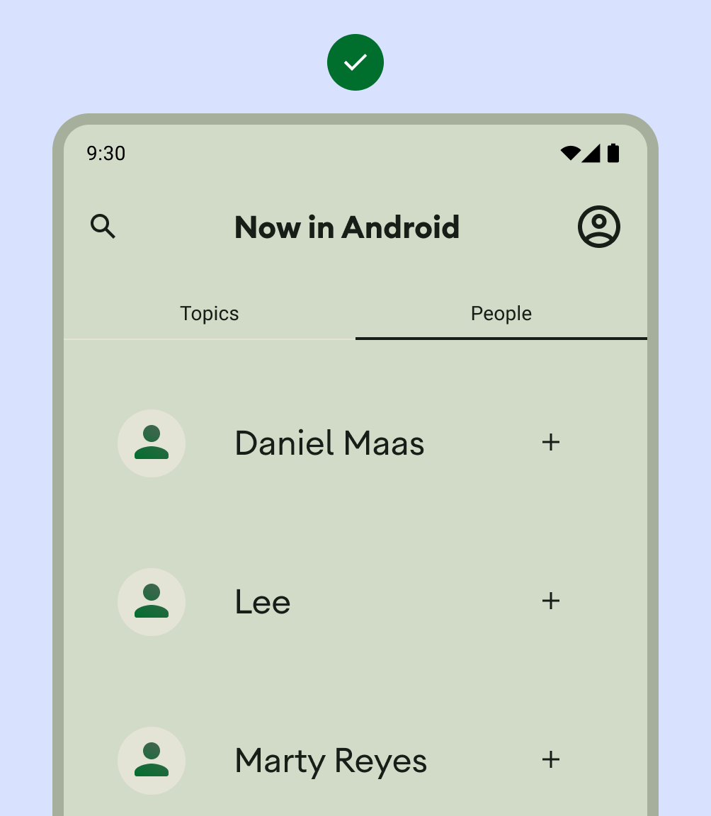 Duy trì các hoạt động tương tác thiết yếu, chẳng hạn như thao tác điều hướng chính, trong một vùng màn hình có thể tiếp cận. Nút hành động nổi (FAB) cung cấp một điểm tương tác nổi bật và dễ tiếp cận
