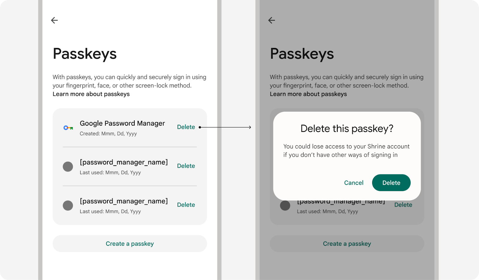 用户可能需要先在您的产品中删除通行密钥,然后再从其密码管理工具中删除,才能彻底删除通行密钥。不过,一旦在任一位置删除通行密钥,该通行密钥将无法再使用。