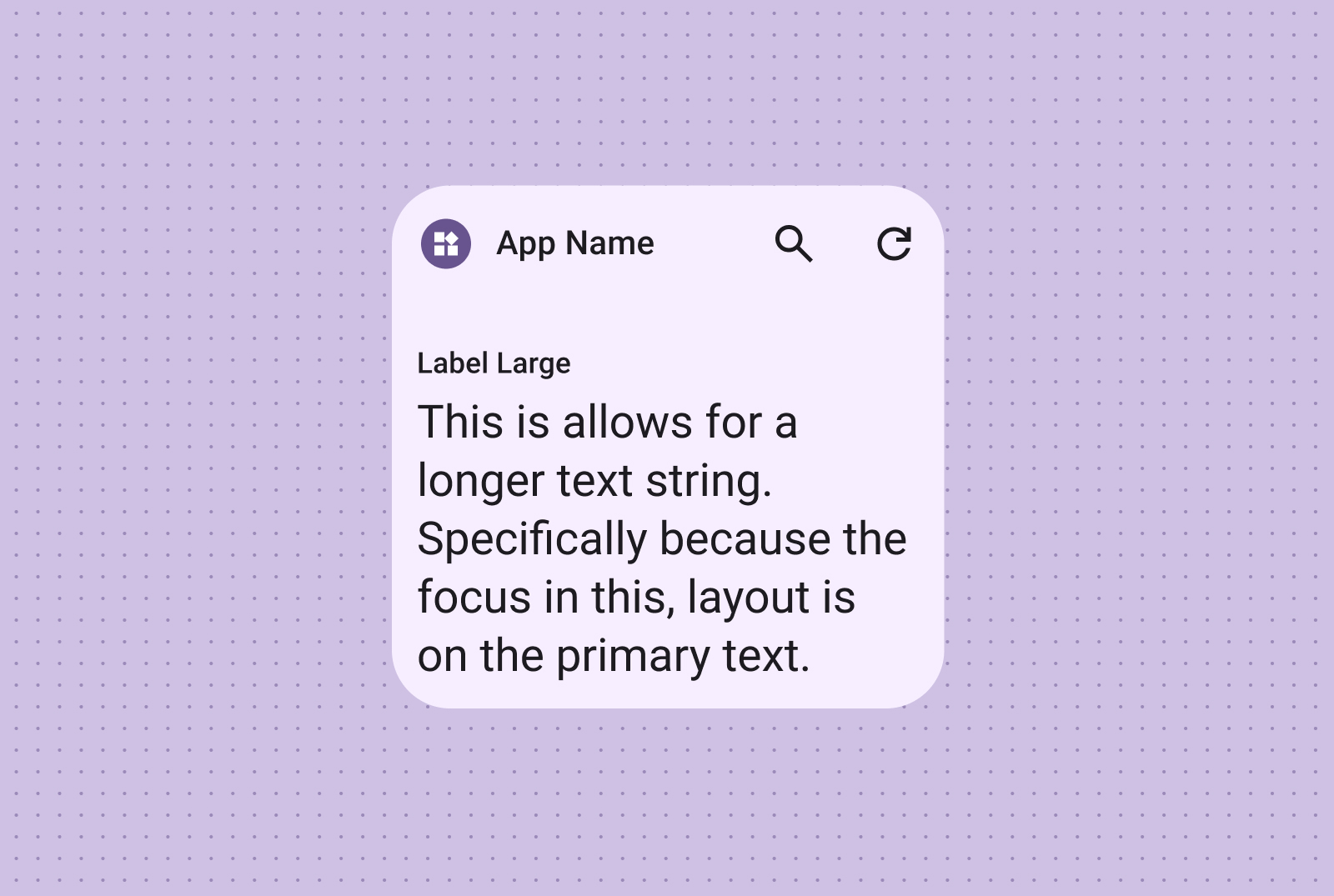 ایده آل برای عنوان، به روز رسانی وضعیت، توضیحات کوتاه، یا هر سناریویی که در آن یک خط متن به طور موثر پیام را منتقل می کند. برای راهنمایی در مورد مقیاس بندی پویا محتوای متن بر اساس اندازه ویجت، به نمونه طرح بندی Canonical مراجعه کنید.