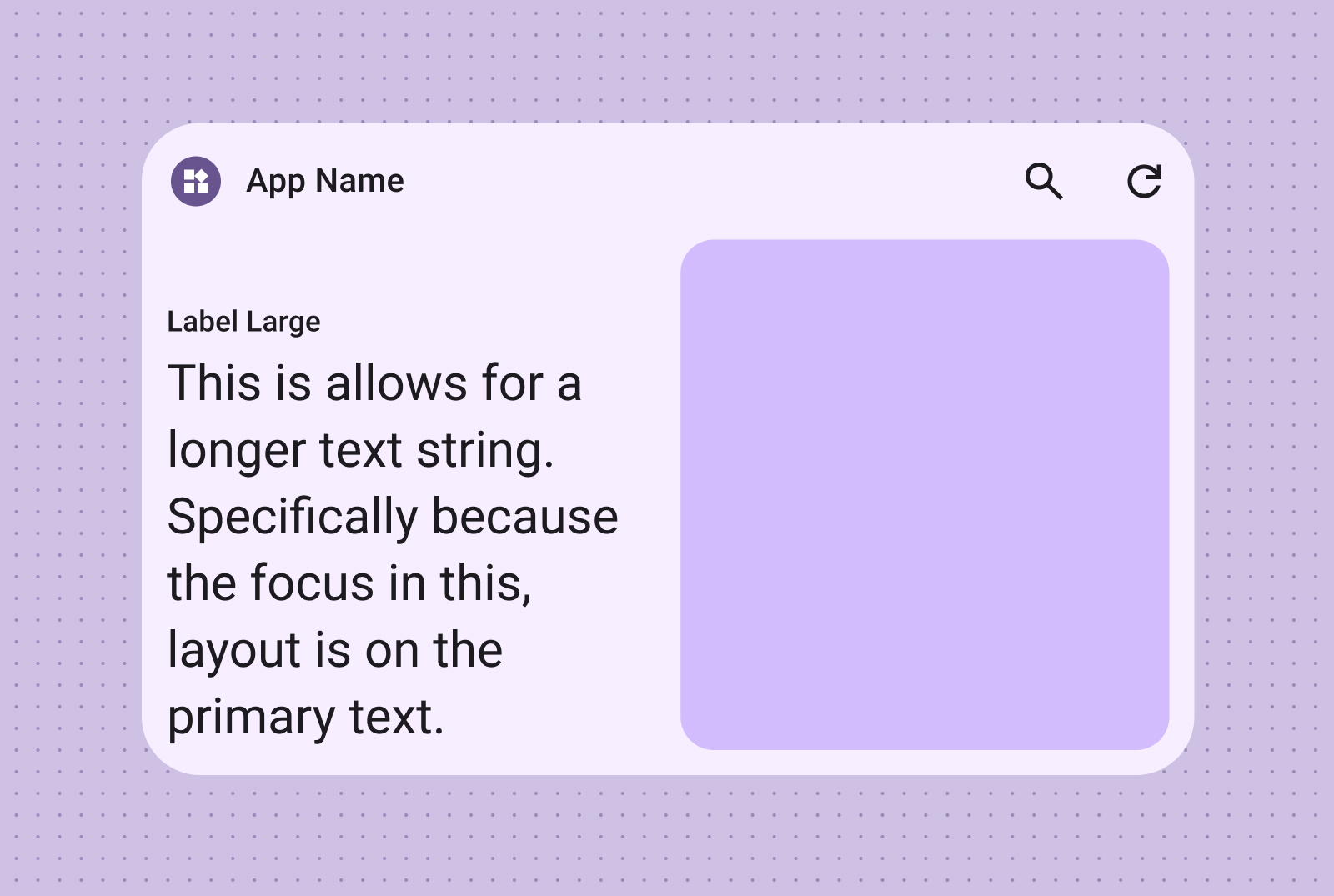 非常适合标题、状态更新、简短说明,或任何单行文本即可有效传达信息的场景。如需有关根据微件大小动态缩放文本内容的指导,请参阅规范布局示例。