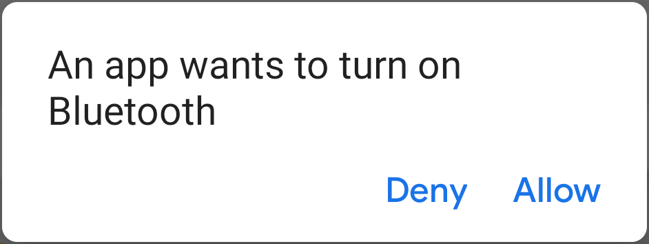 همانطور که در شکل 1 نشان داده شده است، یک گفتگو ظاهر می شود که از کاربر اجازه می دهد تا بلوتوث را فعال کند. اگر کاربر اجازه دهد، سیستم شروع به فعال کردن بلوتوث می کند و پس از تکمیل فرآیند (یا با شکست) تمرکز به برنامه شما برمی گردد.