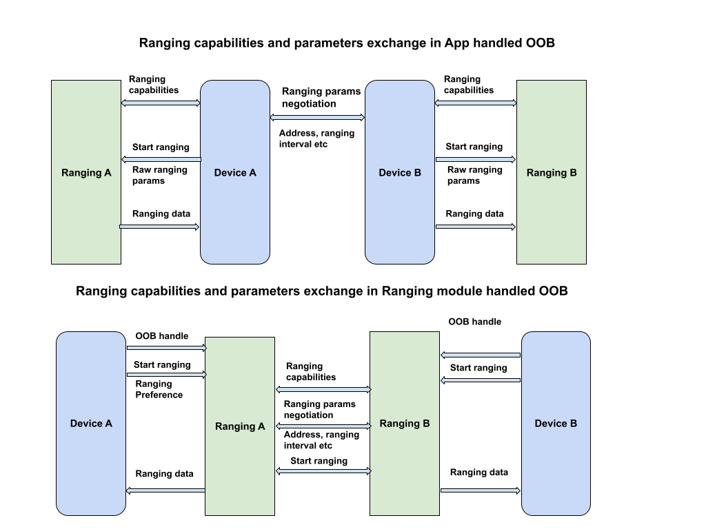 Il modulo Ranging definisce solo il formato e la sequenza dei dati OOB da utilizzare per interagire con un dispositivo peer. Non gestisce il rilevamento dei dispositivi peer o la creazione di una connessione.