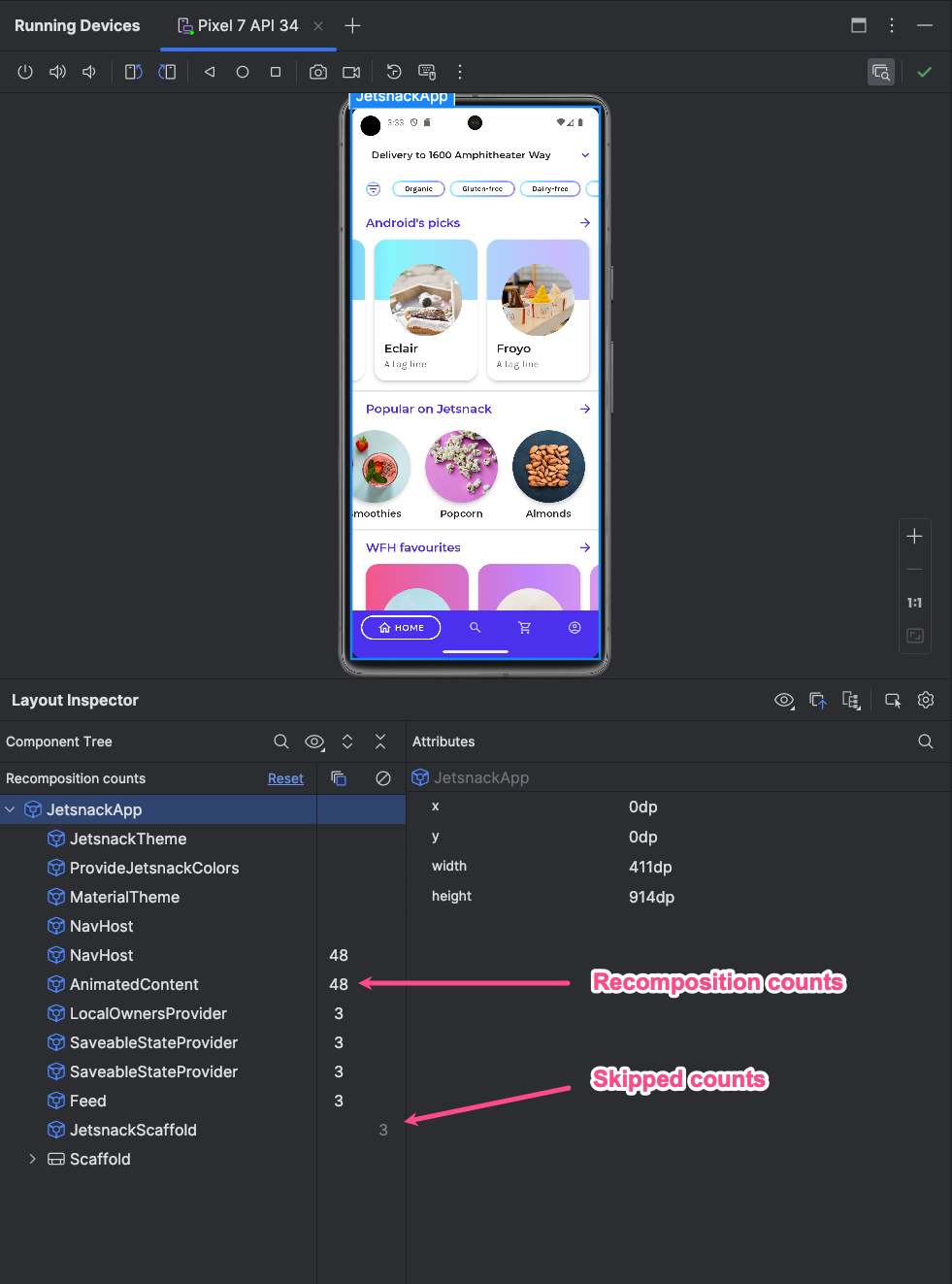 Layout Inspector memungkinkan Anda memeriksa tata letak Compose di dalam aplikasi yang berjalan di emulator atau perangkat fisik. Anda dapat menggunakan Layout Inspector untuk memeriksa seberapa sering composable direkomposisi atau dilewati, yang dapat membantu mengidentifikasi masalah pada aplikasi. Misalnya, beberapa error coding dapat memaksa UI Anda merekomposisi secara berlebihan, yang dapat menyebabkan performa buruk. Beberapa error coding dapat mencegah UI Anda direkomposisi dan, oleh karena itu, mencegah perubahan UI Anda muncul di layar. Jika Anda baru menggunakan Pemeriksa tata letak, lihat panduan tentang cara menjalankannya.
