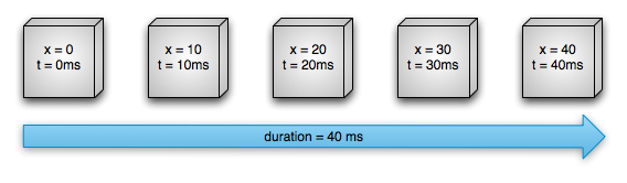 horizontally by 10 pixels. At the end of 40ms, the animation stops, and the object ends at