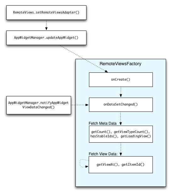 public class StackWidgetService extends RemoteViewsService { @Override public RemoteViewsFactory onGetViewFactory(Intent intent) { return new StackRemoteViewsFactory(this.getApplicationContext(), intent); } } class StackRemoteViewsFactory implements RemoteViewsService.RemoteViewsFactory { // See the RemoteViewsFactory API reference for the full list of methods to // implement. }