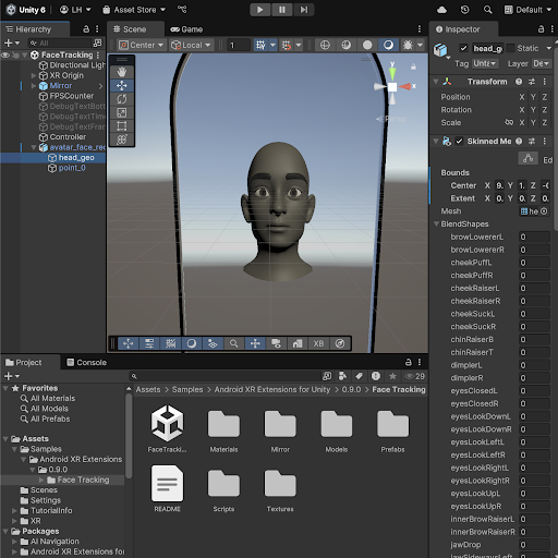 Learn how to build immersive apps with the Android XR Extensions for Unity. This set of samples contains a standalone Unity project sample for each of the features in this Unity package, including face tracking, HandMesh, object tracking, and more.