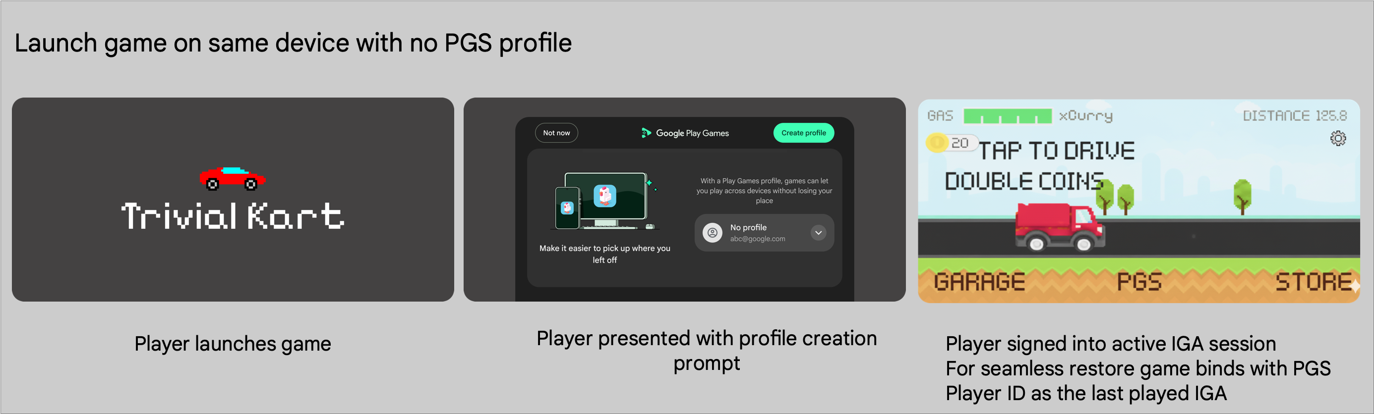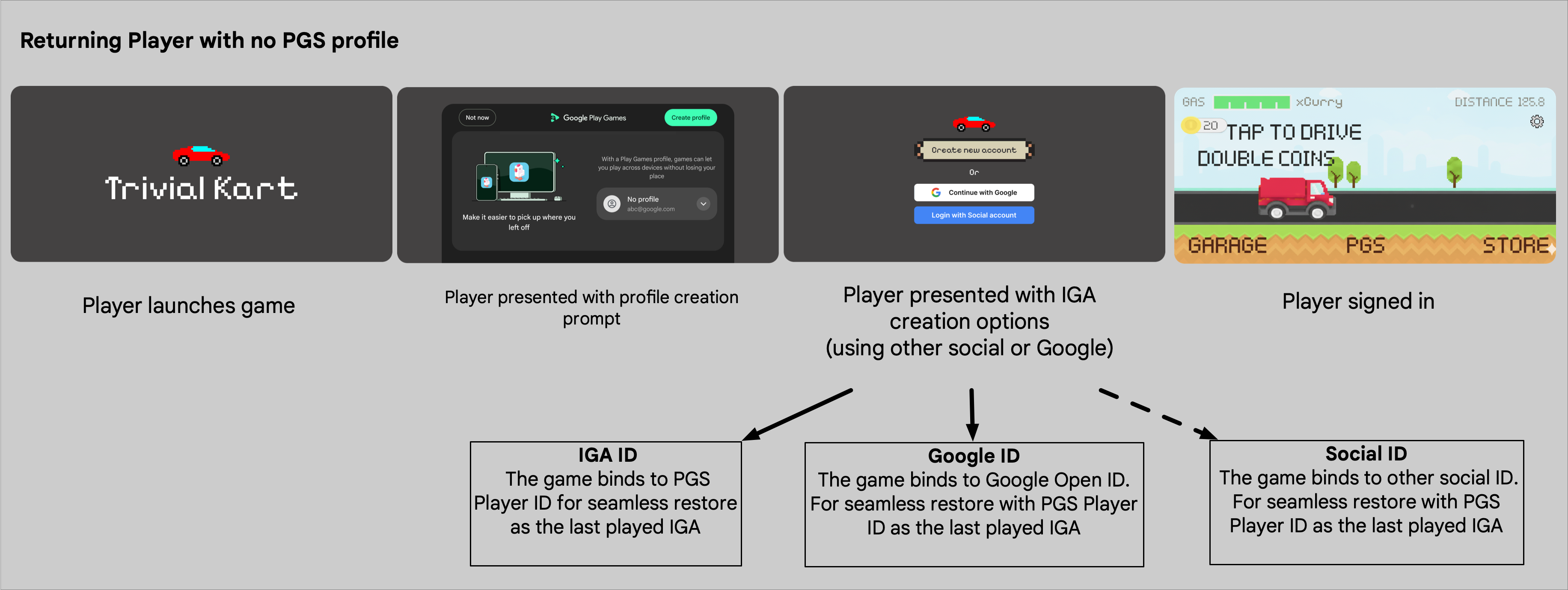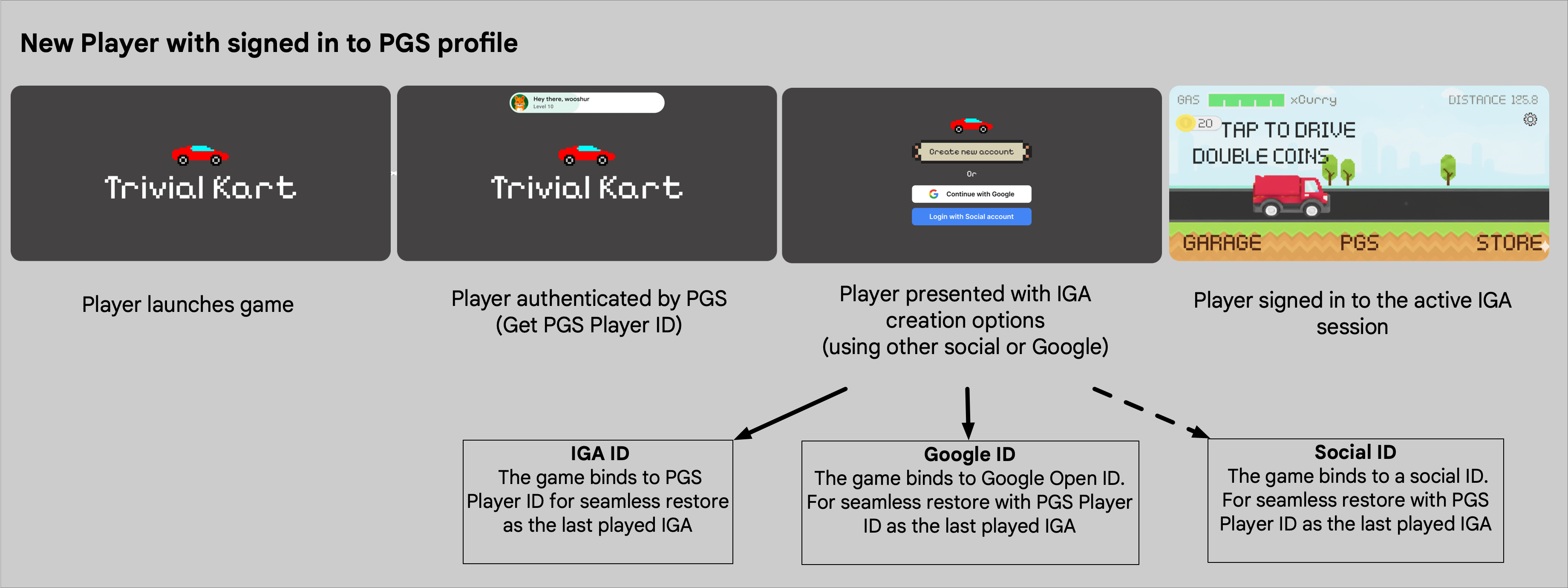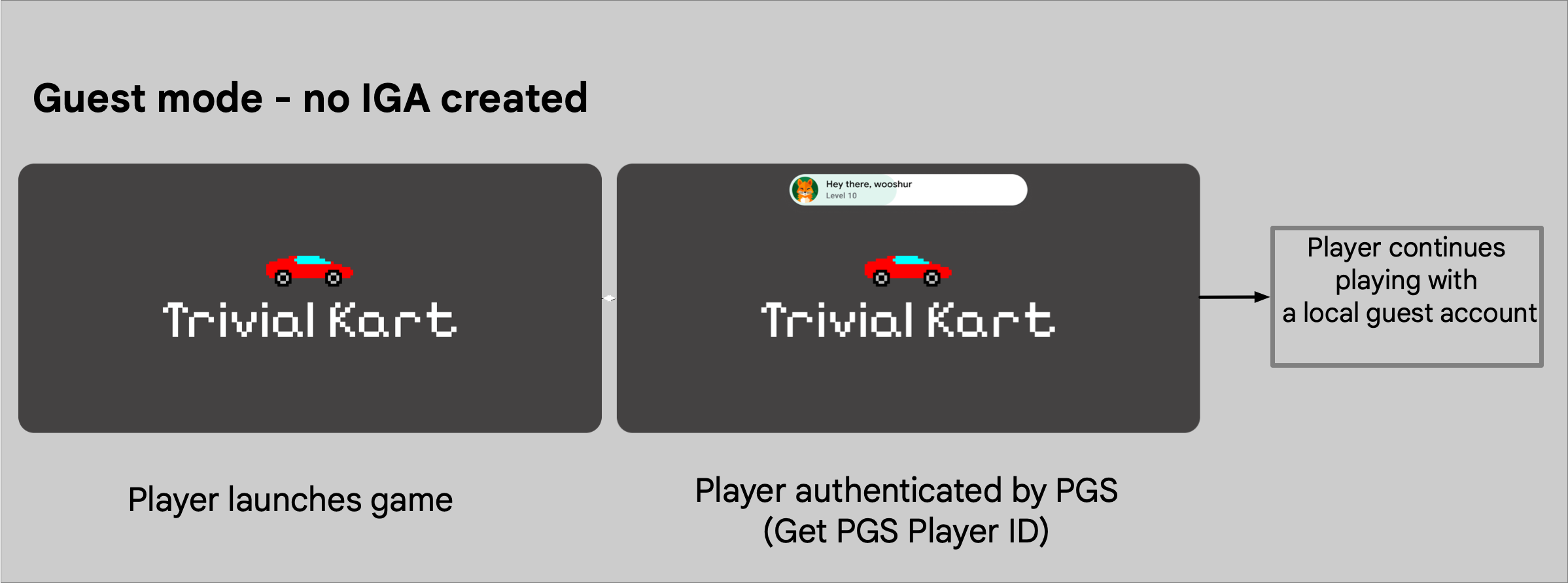 玩家可以启动游戏并使用本地访客账号进行游戏。PGS 仍会在后台进行身份验证。如果玩家选择保存进度,游戏会将临时会话转换为永久 IGA,并将其绑定到 PGS 玩家 ID。
