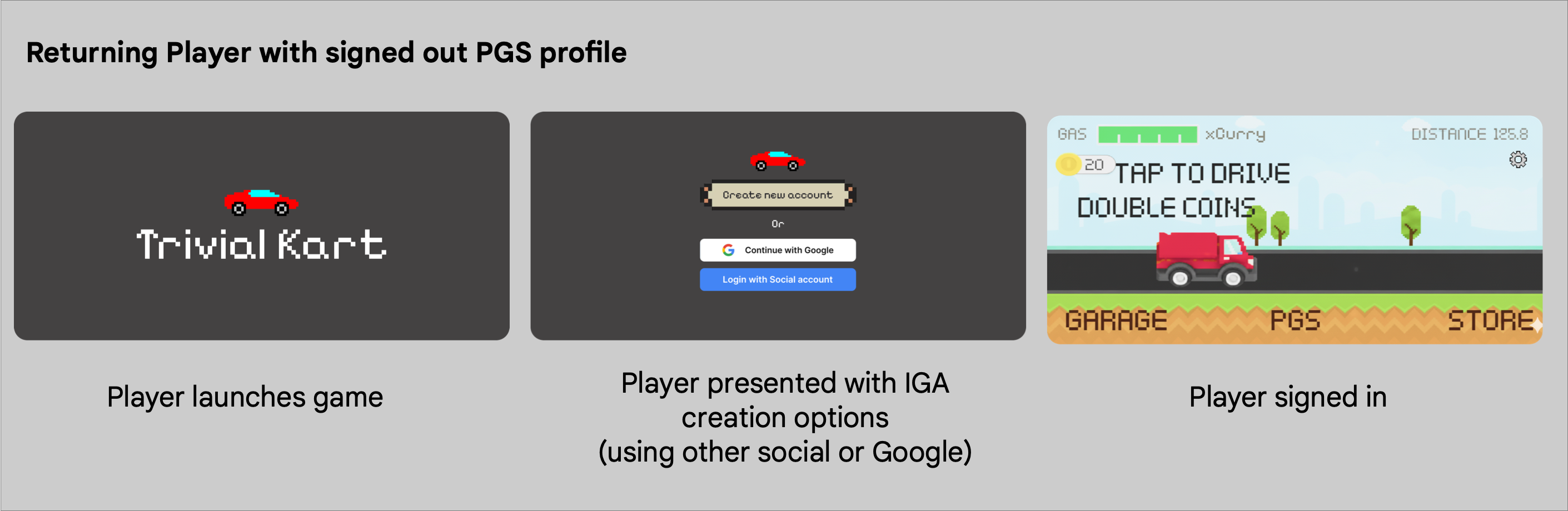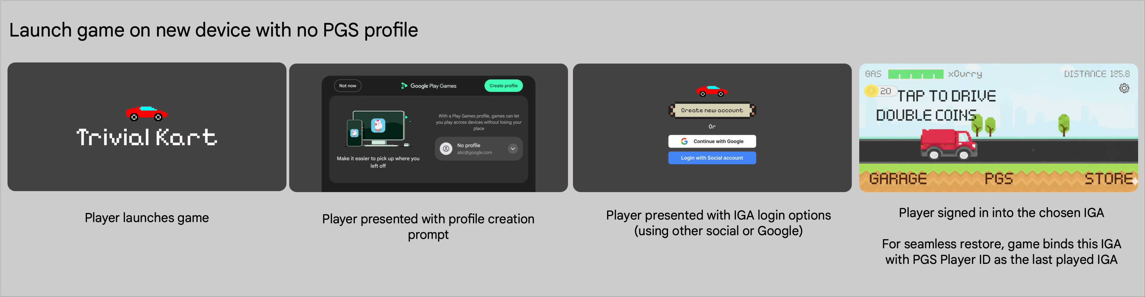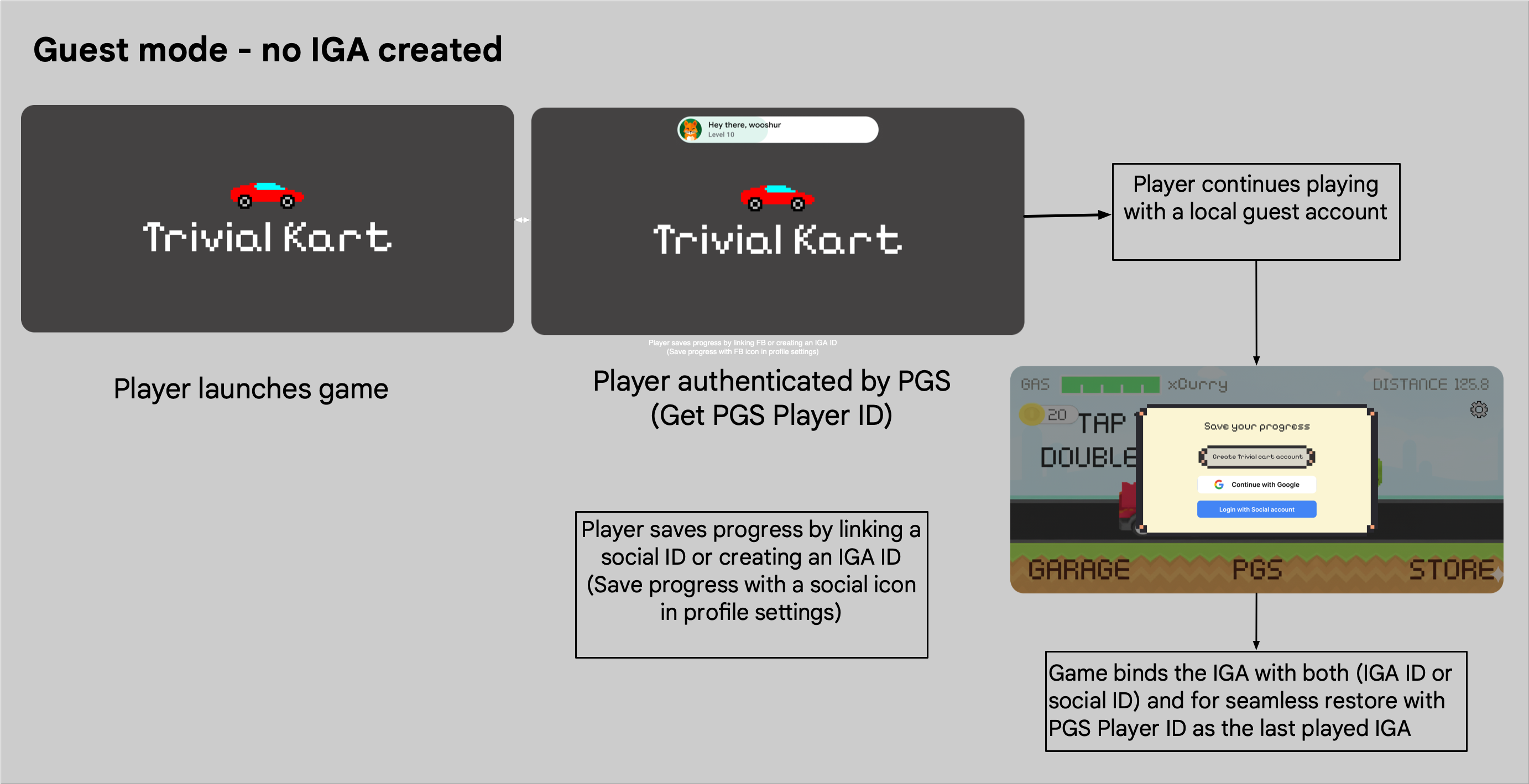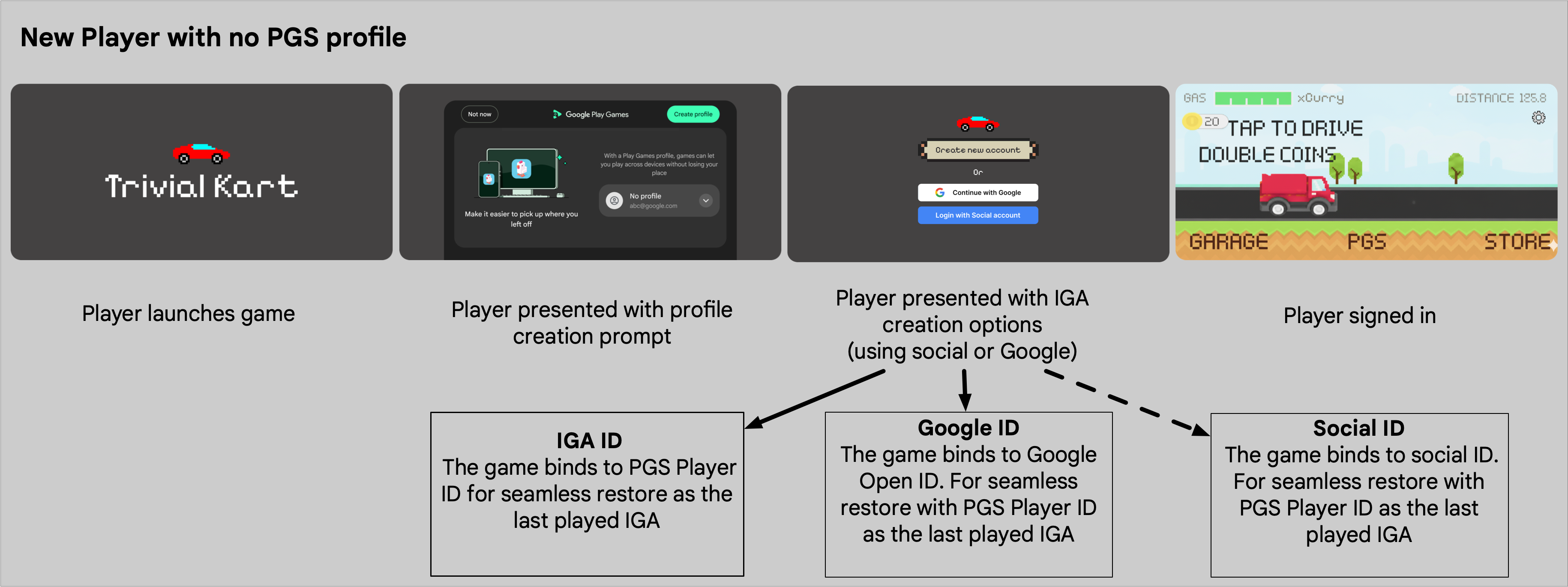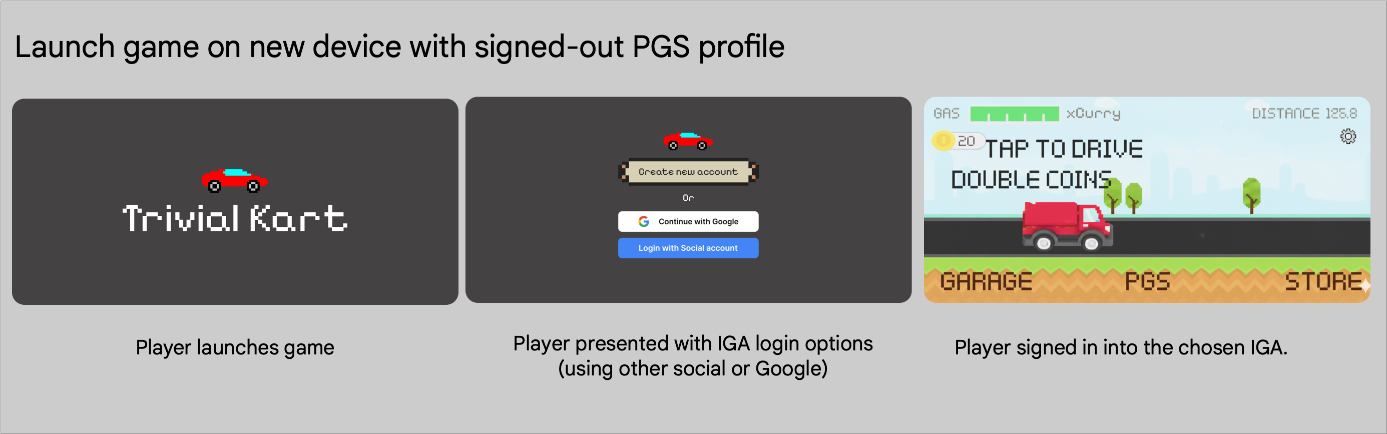 玩家可以启动游戏并使用本地访客账号进行游戏。PGS 仍会在后台进行身份验证。如果玩家选择保存进度,游戏会将临时会话转换为永久 IGA,并将其绑定到 PGS 玩家 ID。