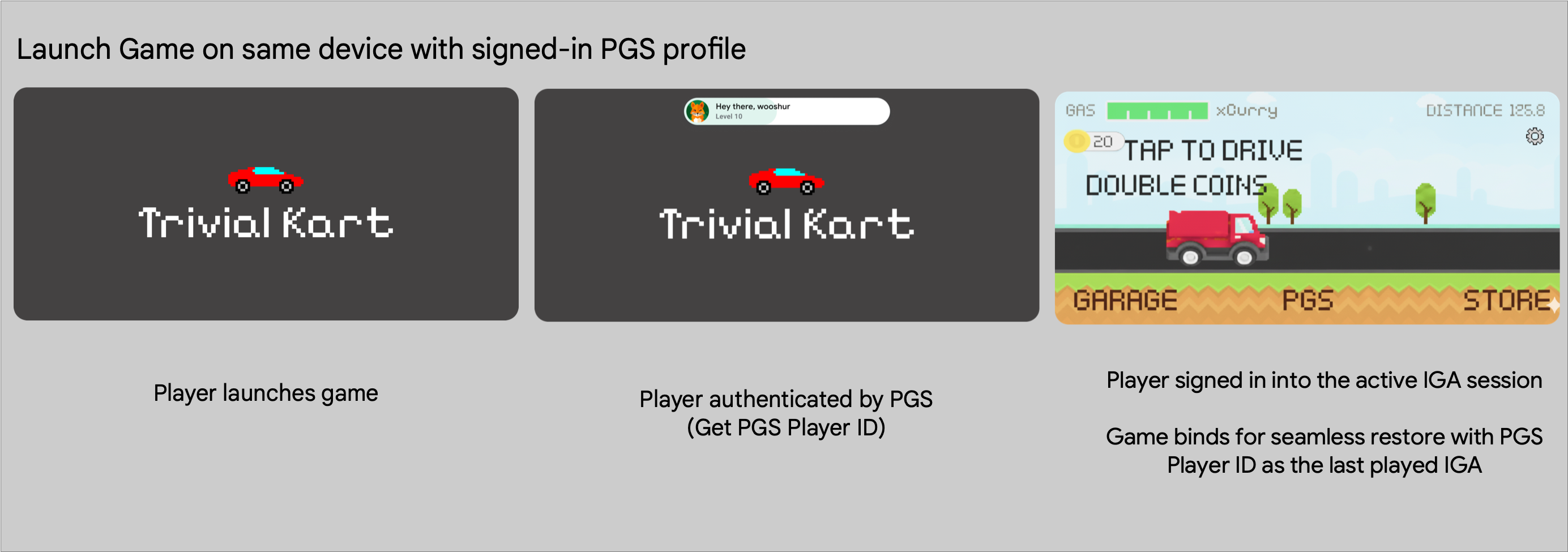 - 如果出现无缝恢复场景,其中上次玩过的 IGA 与 PGS 玩家 ID 相关联,请继续自动恢复关联的 IGA。