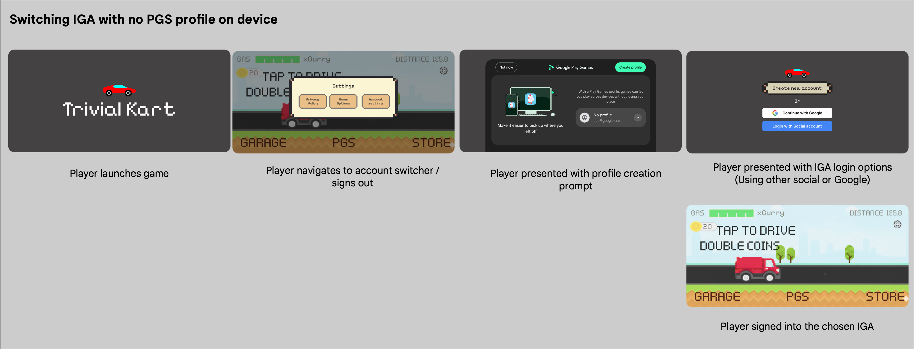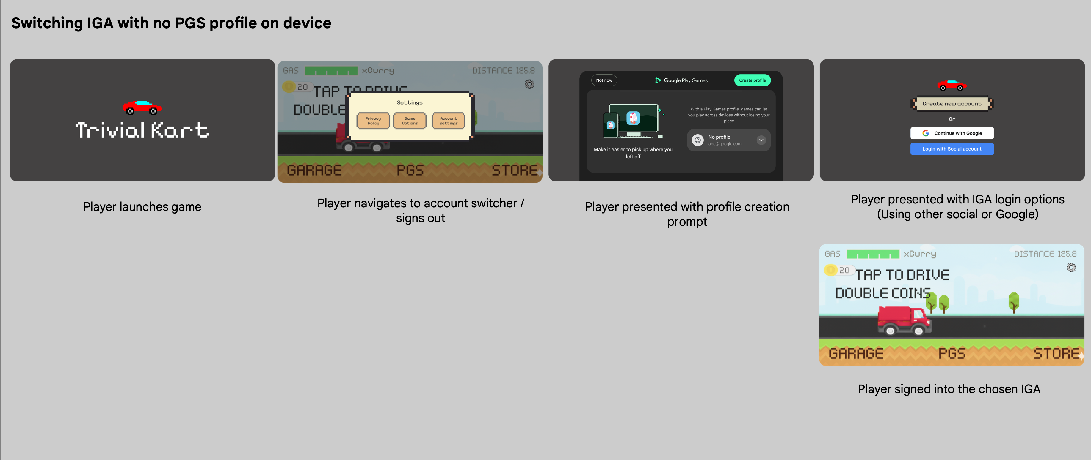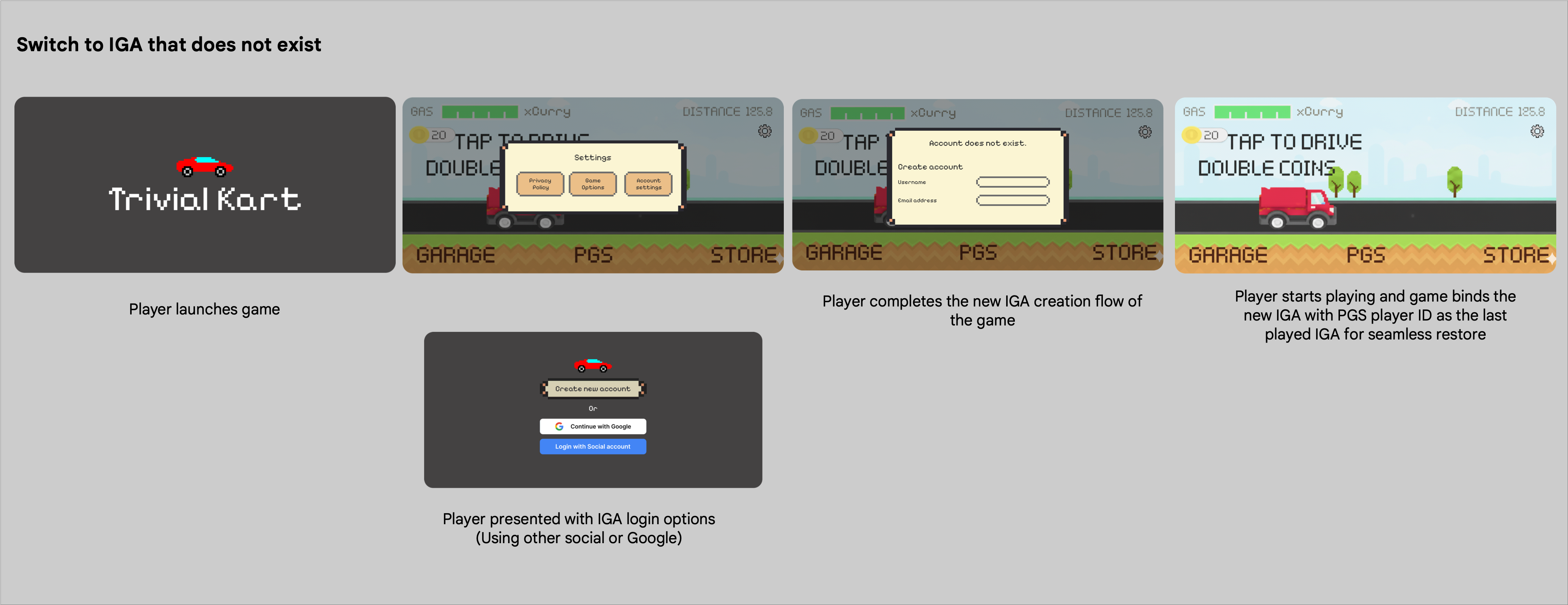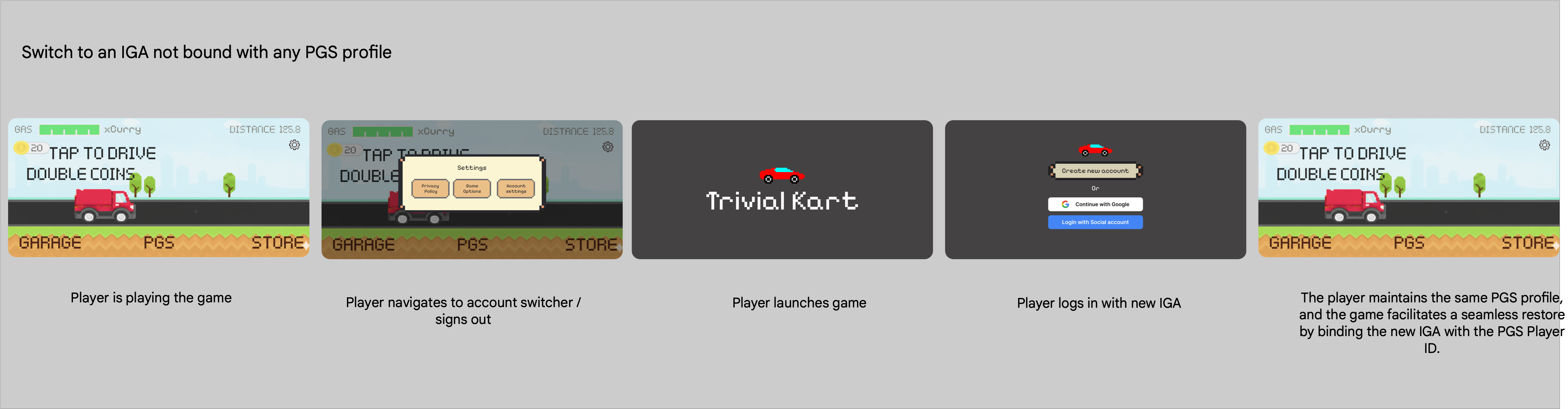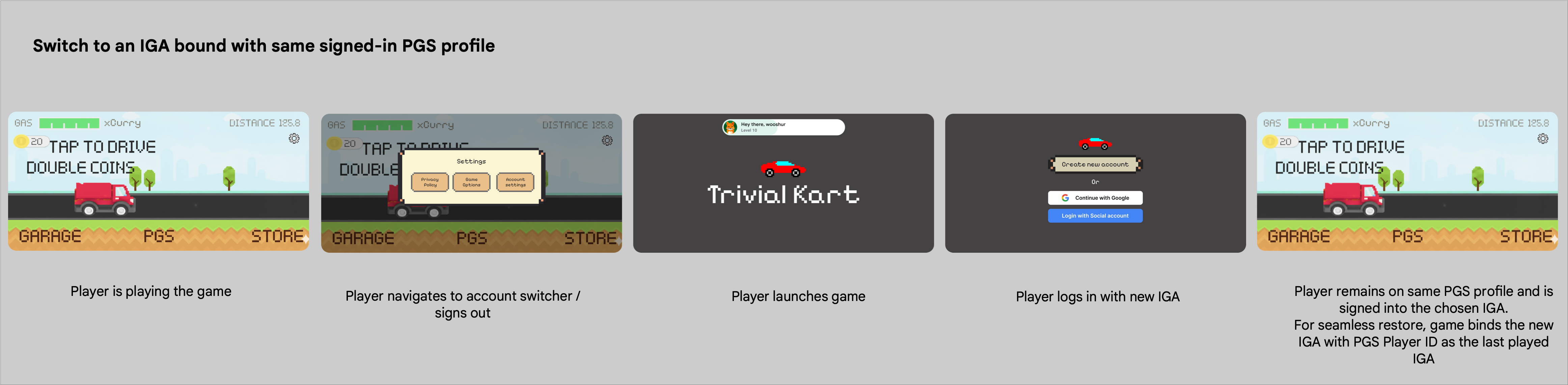 - 当玩家使用其他 IGA 登录时,游戏会将此新账号绑定到当前的 PGS 玩家 ID,作为最后玩过的 IGA,以便无缝恢复。