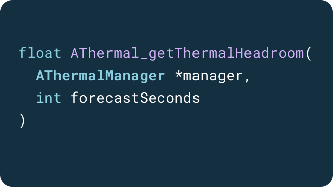 ตรวจสอบแอปตัวอย่างที่แสดงสถานะความร้อนของอุปกรณ์โดยใช้ getThermalHeadroom API และ API การตรวจสอบสถานะความร้อน นอกจากนี้ แอปยังเปลี่ยนภาระงานแบบไดนามิกโดยอิงตามคำแนะนำของ API และใช้ PerformanceHintManager API เพื่อควบคุมประสิทธิภาพการแสดงผลเทรดด้วย