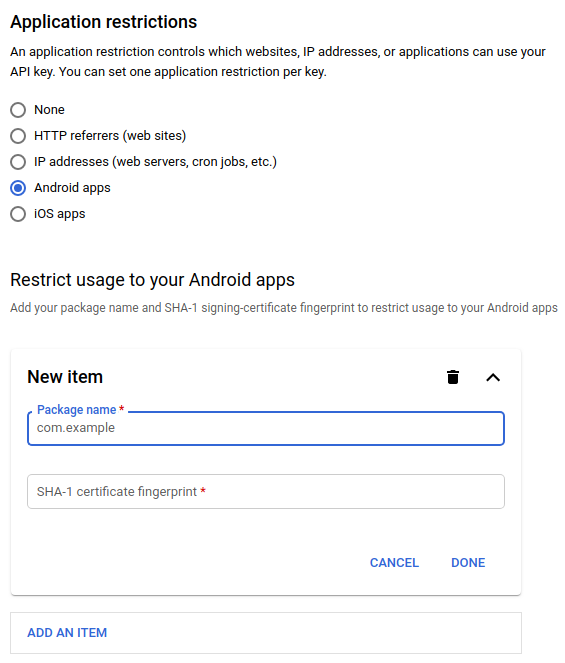 - 애플리케이션 제한사항에서 Android 앱을 선택합니다.
