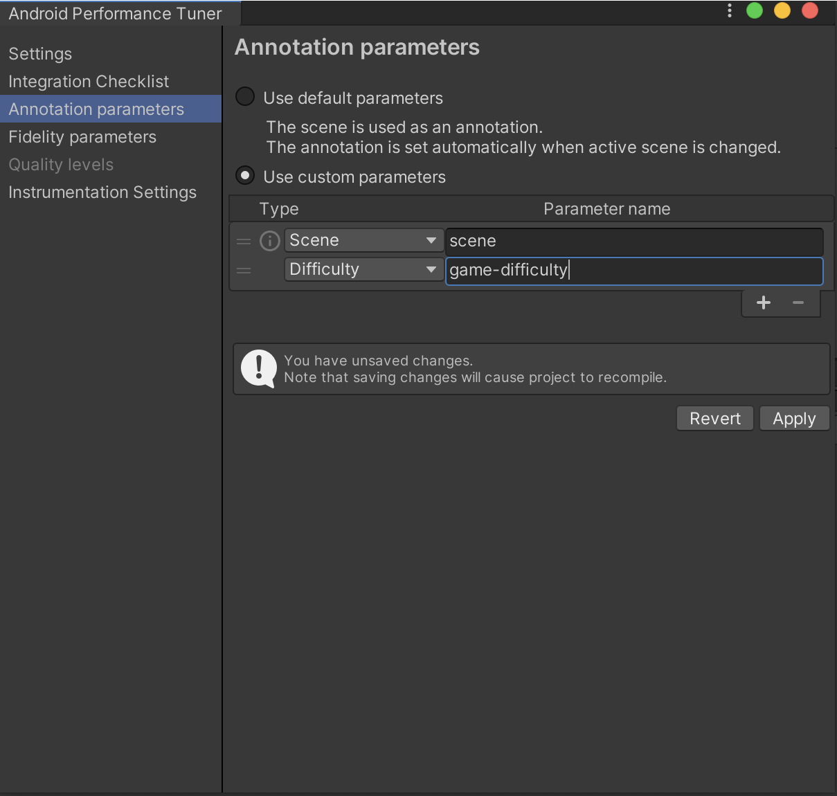 Parameter ini dapat dikelompokkan ulang menjadi tingkat kualitas (misalnya "rendah", "sedang", dan "tinggi"). Agar parameter ini dilaporkan dengan benar oleh Android Performance Tuner, lalu dianalisis dan divisualisasikan di Konsol Google Play, Anda harus menampilkan parameter ke plugin. Tambahkan parameter fidelitas di tab Parameter fidelitas.