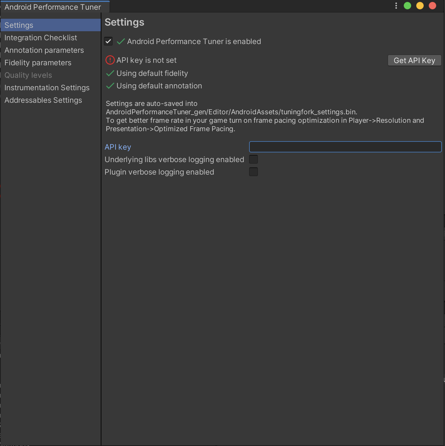 Enable the Android Frame Pacing library. Android Performance Tuner will use this library to measure the performance of your game, including more in-depth measures than what Unity alone reports.