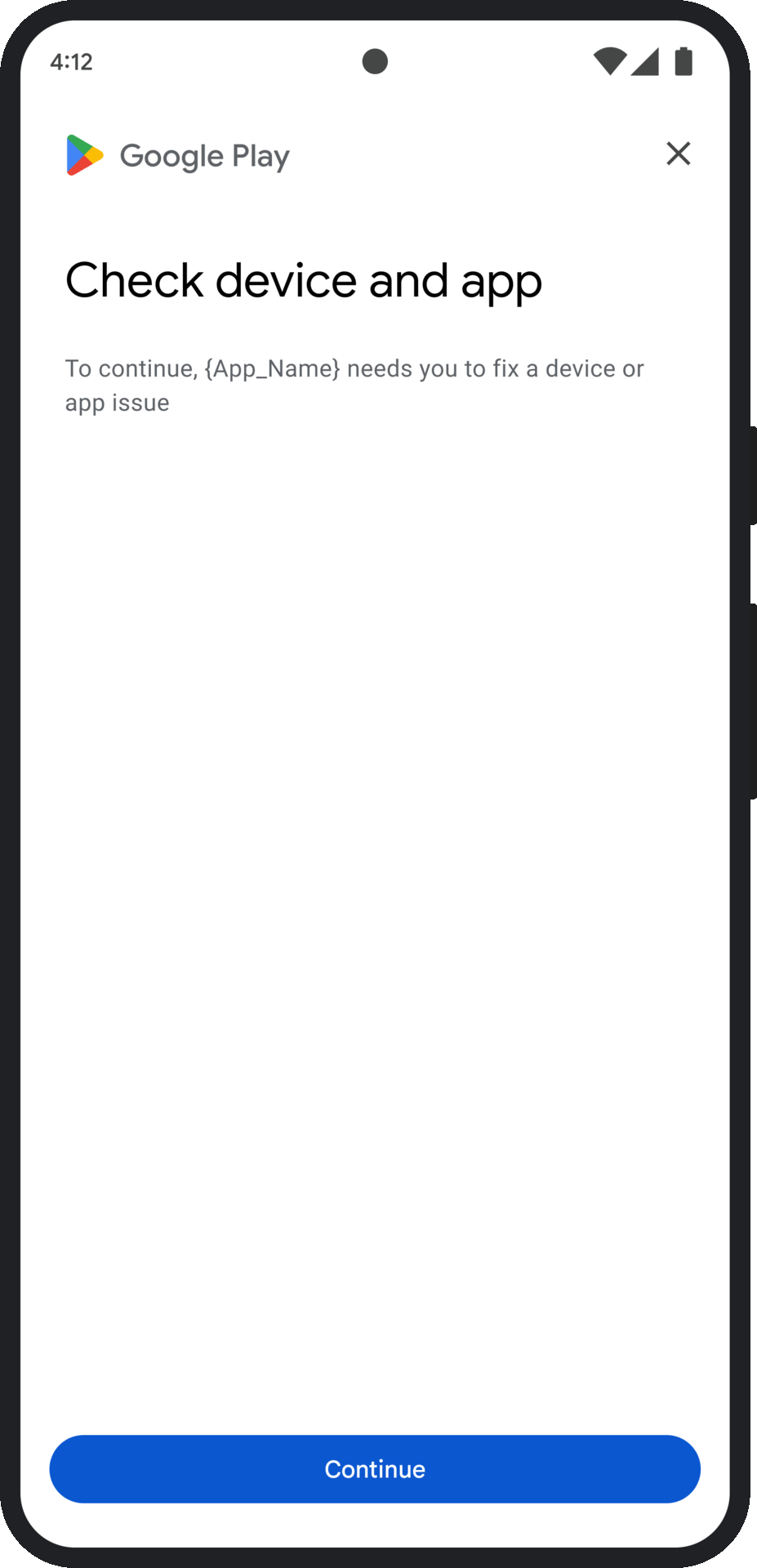 - Exceções do lado do cliente: a caixa de diálogo verifica e tenta resolver problemas subjacentes que causaram uma exceção da API Integrity. Por exemplo, ele pode pedir que o usuário atualize uma versão desatualizada do Google Play Services.