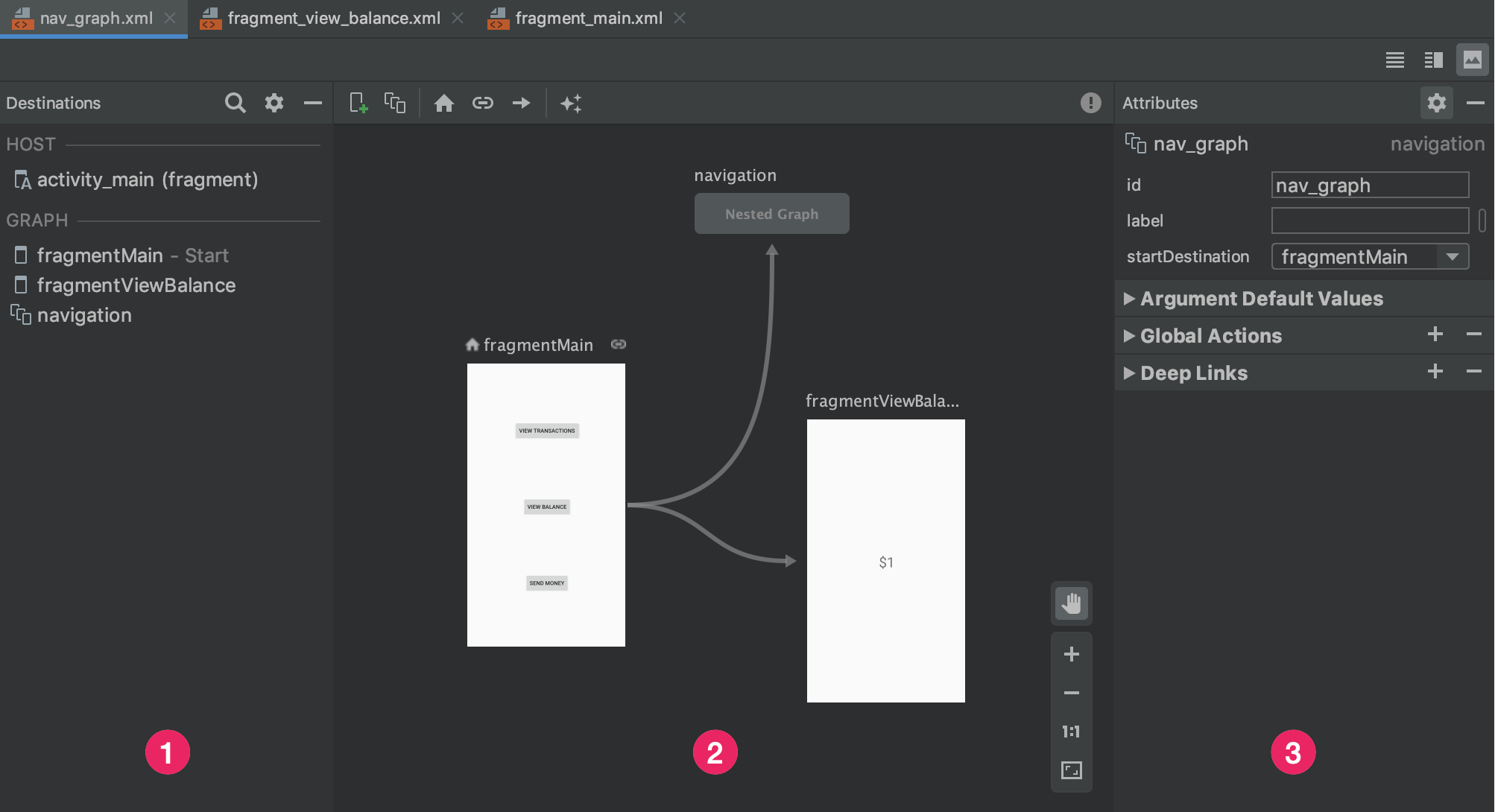 - Graph Editor : شامل یک نمایش بصری از نمودار ناوبری شما است. میتوانید بین نمای طراحی و نمایش XML زیرین در نمای متن جابجا شوید.