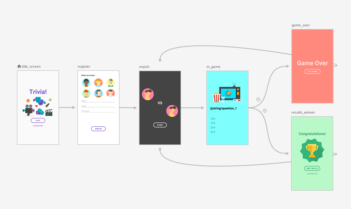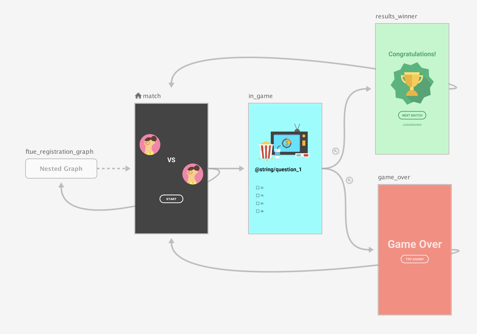 একটি সর্বোত্তম অনুশীলন হিসাবে, শীর্ষ-স্তরের নেভিগেশন গ্রাফের শুরুর গন্তব্য হিসাবে ম্যাচ স্ক্রীন সেট করুন এবং শিরোনামটি সরান এবং স্ক্রীনগুলিকে নেস্টেড গ্রাফে রেজিস্টার করুন, যেমন চিত্র 1 এ দেখানো হয়েছে: