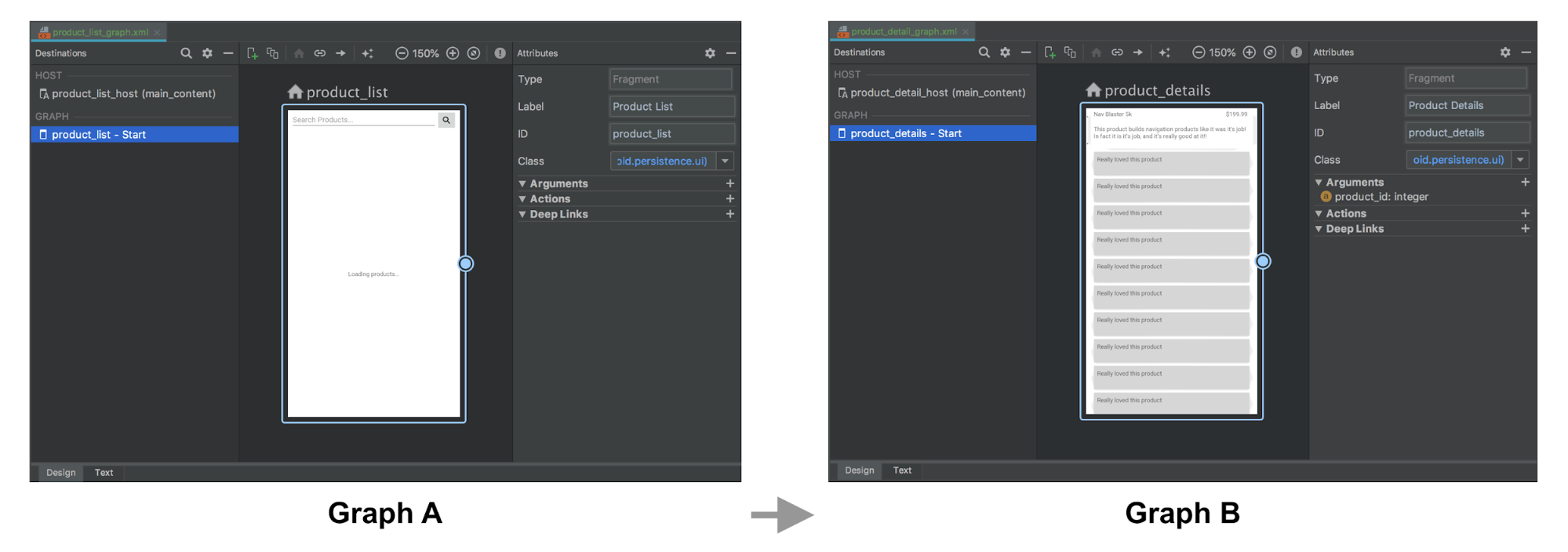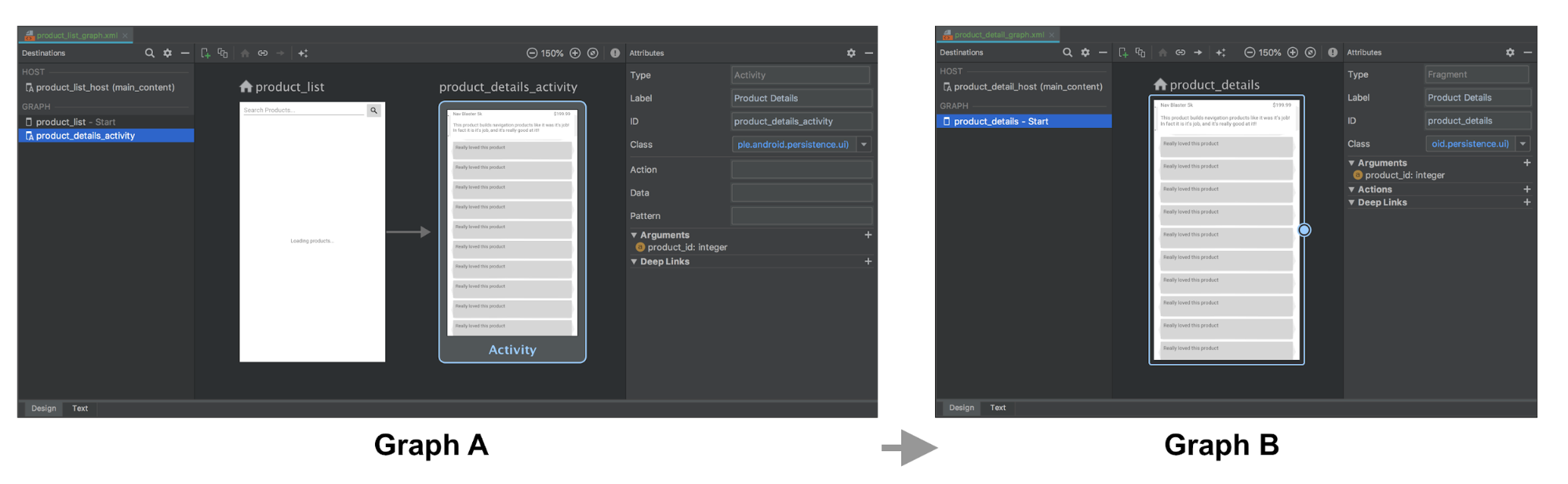 ثابت نگه داشتن نام اقدامات خود در حین ادغام می تواند این فرآیند را یکپارچه کند و نیازی به تغییر در پایگاه کد موجود شما نداشته باشد. به عنوان مثال، navigateToProductDetail در اینجا یکسان باقی می ماند. تنها تفاوت این است که این اکشن اکنون به جای یک مقصد فعالیت، هدایت به یک مقصد قطعه را در همان NavHost نشان می دهد: