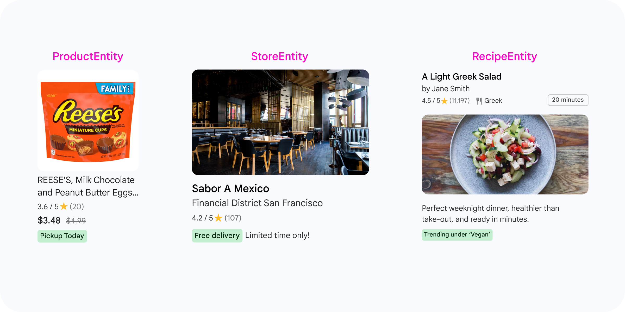 Figura : "ProductEntity", "StoreEntity" y "RecipeEntity". (*IU solo con fines ilustrativos) - Un clúster de Recommendation puede estar formado por fichas de