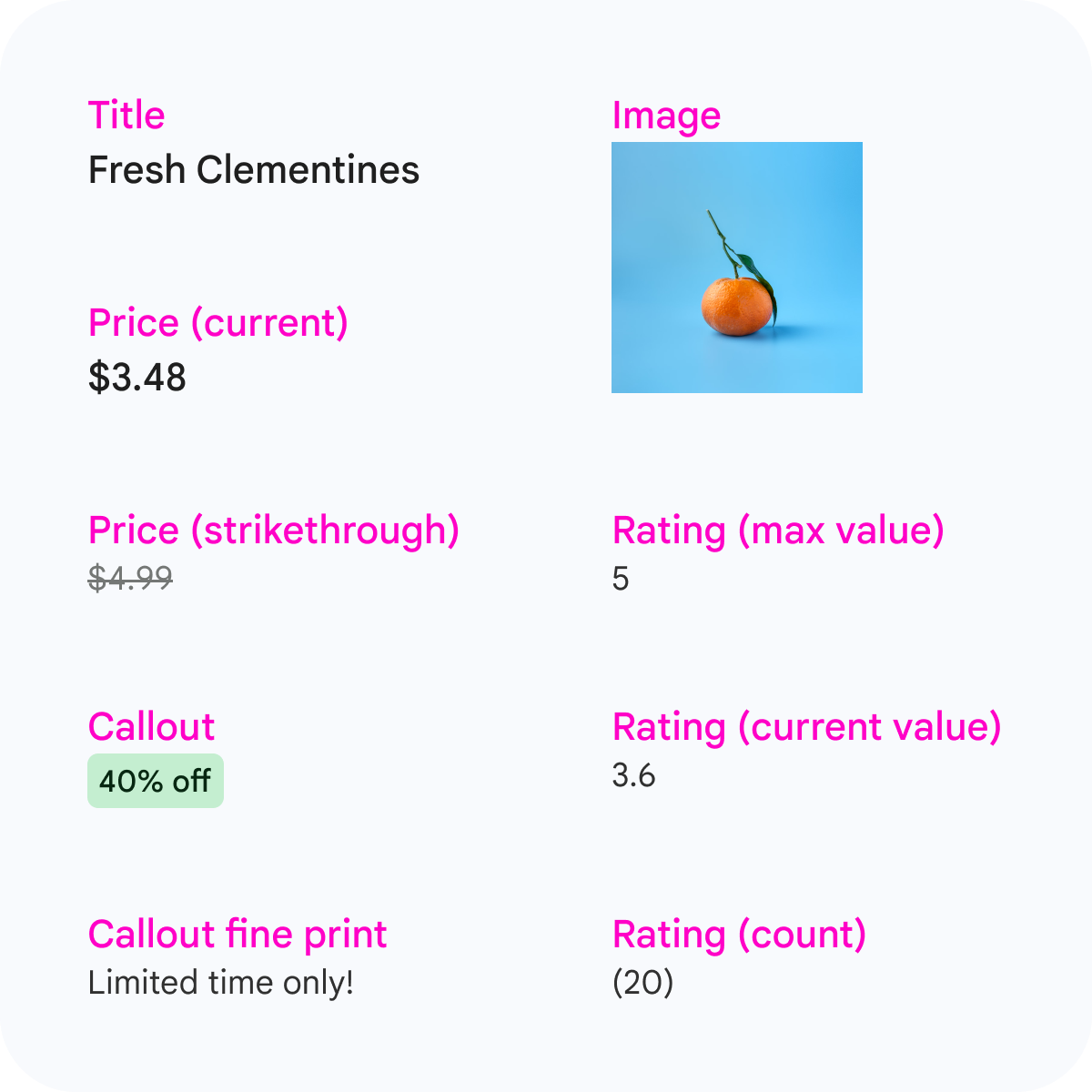 | Precio (tachado) | Opcional | Es el precio original de la entidad, que aparece tachado en la IU. | Texto libre |