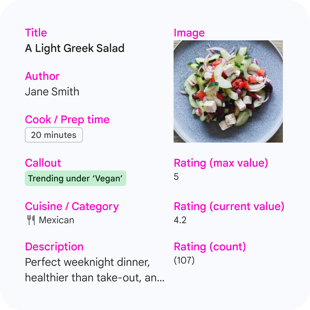 | Calificación: Valor de recuento | Opcional | Es la cantidad de calificaciones de la receta. Nota: Proporciona este campo si no deseas controlar la lógica de abreviatura de la pantalla por tu cuenta. Si se incluyen tanto el recuento como el valor del recuento, usaremos el recuento para mostrarlo a los usuarios. |