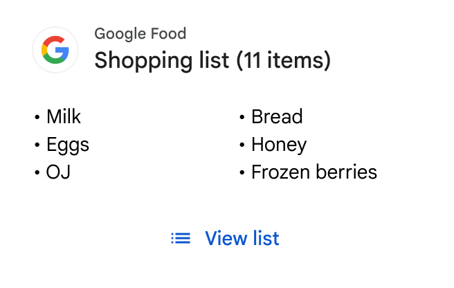 El clúster de Food Shopping List muestra un adelanto de las listas de compras de comestibles de muchos socios desarrolladores en una agrupación de IU, lo que les indica a los usuarios que vuelvan a la app correspondiente para actualizar y completar sus listas. Hay un solo clúster de Food Shopping List.