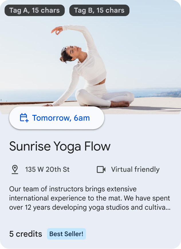 图 2:界面显示了“推荐”集群中的单个 PersonEntity。 EventEntity:EventEntity 表示未来发生的活动。活动开始时间是一项需要传达给用户的关键信息。此实体可用于显示与健康和健身相关的活动,例如献血营、培训课程、健身房或瑜伽课程等。