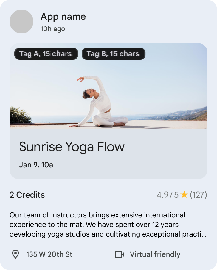 図 2: おすすめコンテンツ クラスタ内の単一の PersonEntity を示す UI。 EventEntity: EventEntity は、将来発生するイベントを表します。イベントの開始時間は、ユーザーに伝える必要がある重要な情報です。このエンティティは、健康とフィットネスに関連するイベント(献血キャンプ、トレーニング セッション、ジムやヨガのクラスなど)を表示するために使用できます。