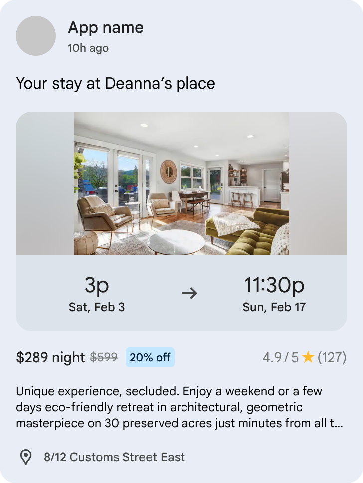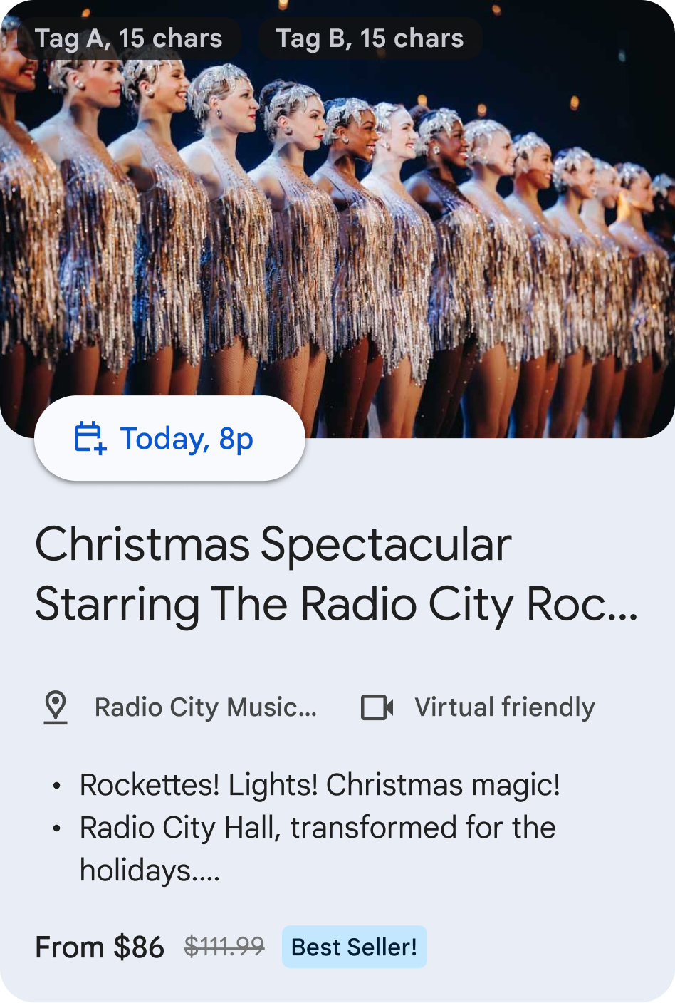 ArticleEntity : ArticleEntity که یک توصیه مبتنی بر متن برای محتوای مرتبط با بیش از یک دسته محتوا را نشان می دهد. آیتم ArticleEntity به توسعه دهندگان این امکان را می دهد که محتوای متنی و تصویری متنوعی را با ابرداده های بیشتری برای بیان اطلاعات به کاربران در مقایسه با GenericFeaturedEntity ارائه دهند. مثال: محتوای بازاریابی، قطعه خبر