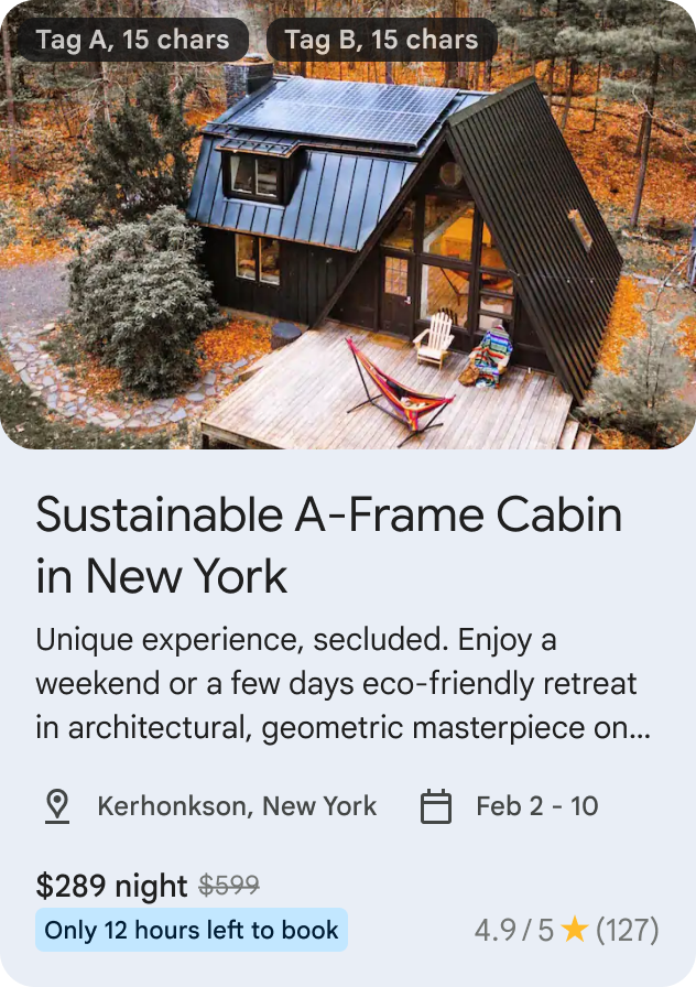 شکل 3: UI که یک LodgingEntity را در کلاستر Recommendations نشان می دهد. StoreEntity : StoreEntity یک فروشگاه، رستوران، کافه و غیره را نشان میدهد. محتوایی را که در آن مکان غذاخوری یا فروشگاه، بخش مهمی از اطلاعات است که باید به کاربران منتقل شود، برجسته میکند.