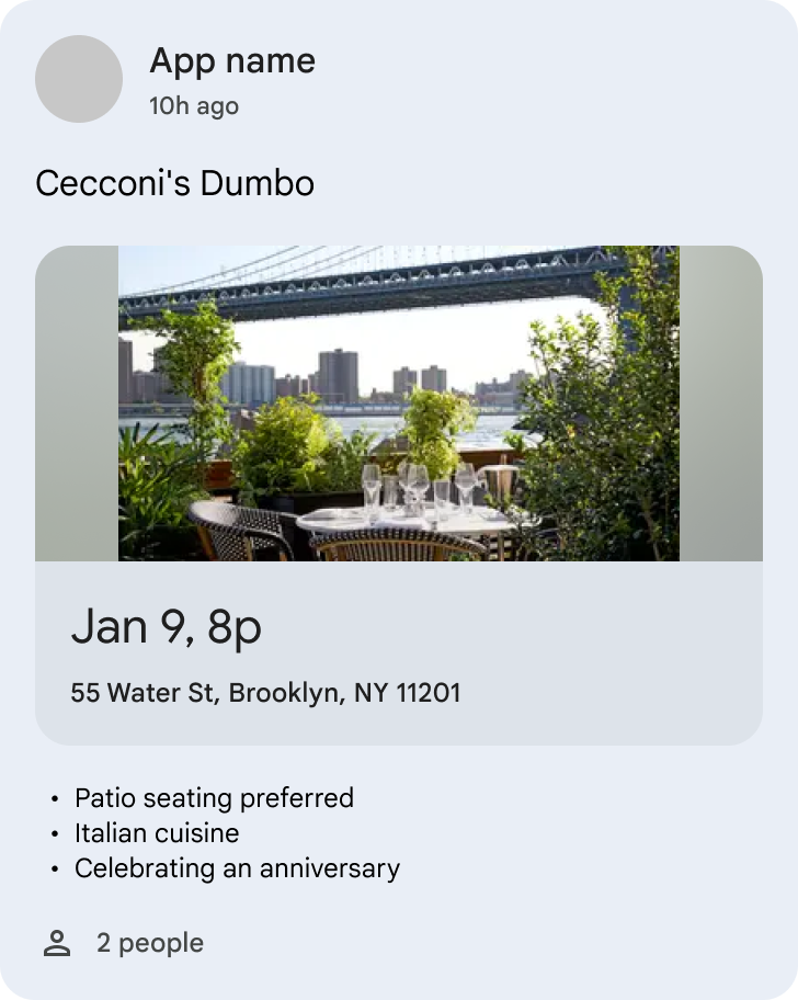 Im Cluster Reservierung werden Inhalte angezeigt, mit denen Nutzer kürzlich interagiert haben. Die Inhalte stammen von mehreren Entwicklerpartnern und sind in einer einzigen Benutzeroberflächengruppe zusammengefasst. Jeder Entwicklerpartner darf maximal 10 Entitäten im Reservierungscluster übertragen.
