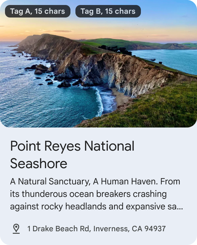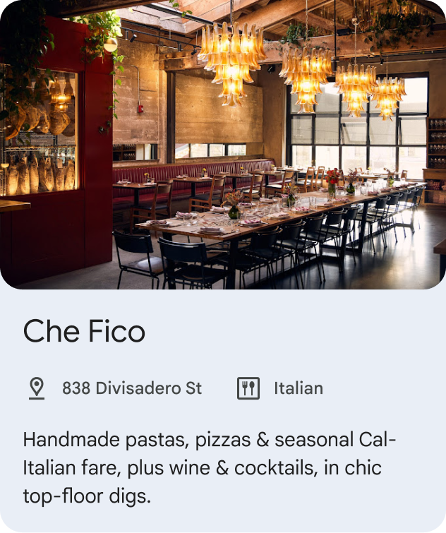 الشكل 4: واجهة مستخدم تعرض عنصر StoreEntity واحدًا ضمن مجموعة الاقتراحات. PointOfInterestEntity: يمثّل PointOfInterestEntity مكانًا يهمّ المستخدمين، مثل محطة وقود أو مكان إقامة فعالية أو مدينة ملاهٍ أو متحف أو موقع سياحي أو مسار للمشي لمسافات طويلة وما إلى ذلك. ويسلّط الضوء على المحتوى الذي يشكّل فيه الموقع الجغرافي جزءًا مهمًا من المعلومات التي يجب نقلها إلى المستخدمين. ولا يجب استخدامها في أماكن الإقامة أو المتاجر أو أماكن تناول الطعام.