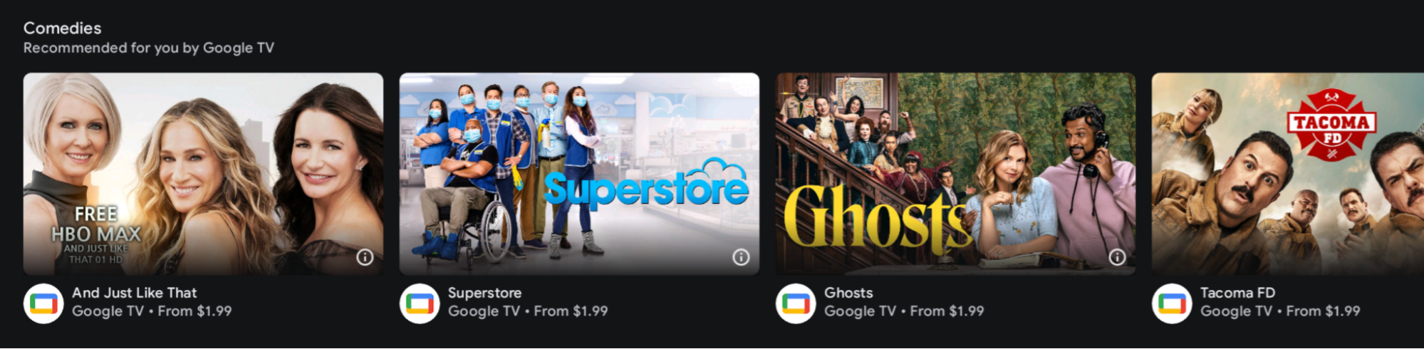 Figura 1: IU de Entertainment Space que muestra un clúster de Recommendation de un único socio Entidad: Es un objeto que representa un solo elemento en un clúster. Una entidad puede ser una película, un programa de TV, una serie de TV, videos en vivo y mucho más. Consulta la sección para proporcionar los datos de la entidad si quieres obtener una lista de los tipos de entidades compatibles.