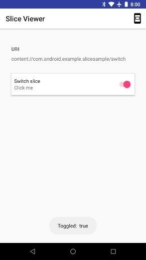 class MyBroadcastReceiver : BroadcastReceiver() { override fun onReceive(context: Context, intent: Intent) { if (intent.hasExtra(Slice.EXTRA_TOGGLE_STATE)) { Toast.makeText(context, "Toggled: " + intent.getBooleanExtra( Slice.EXTRA_TOGGLE_STATE, false), Toast.LENGTH_LONG).show() } } companion object { const val EXTRA_MESSAGE = "message" } }
