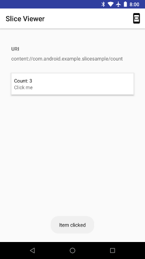 fun createDynamicSlice(sliceUri: Uri): Slice { return when (sliceUri.path) { "/count" -> { val toastAndIncrementAction = SliceAction.create( createToastAndIncrementIntent("Item clicked."), actionIcon, ListBuilder.ICON_IMAGE, "Increment." ) list(context, sliceUri, ListBuilder.INFINITY) { row { primaryAction = toastAndIncrementAction title = "Count: ${MyBroadcastReceiver.receivedCount}" subtitle = "Click me" } } } else -> { list(context, sliceUri, ListBuilder.INFINITY) { row { primaryAction = createActivityAction() title = "URI not found." } } } } }