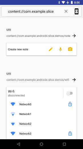 هر Slice یک URI مرتبط دارد. هنگامی که سطحی می خواهد یک Slice را نمایش دهد، با این URI یک درخواست الزام آور برای برنامه شما ارسال می کند. سپس برنامه شما به این درخواست رسیدگی می کند و به صورت پویا Slice را از طریق روش onBindSlice