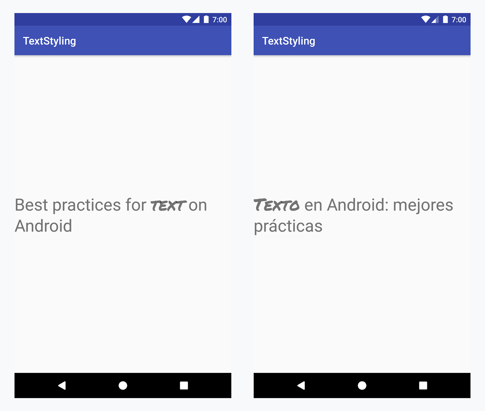 // get the text as SpannedString so we can get the spans attached to the text SpannedString titleText = (SpannedString) getText(R.string.title); // get all the annotation spans from the text Annotation[] annotations = titleText.getSpans(0, titleText.length(), Annotation.class); // create a copy of the title text as a SpannableString. // the constructor copies both the text and the spans. so we can add and remove spans SpannableString spannableString = new SpannableString(titleText); // iterate through all the annotation spans for (Annotation annotation: annotations) { // look for the span with the key font if (annotation.getKey().equals("font")) { String fontName = annotation.getValue(); // check the value associated to the annotation key if (fontName.equals("title_emphasis")) { // create the typeface Typeface typeface = ResourcesCompat.getFont(this, R.font.roboto_mono); // set the span at the same indices as the annotation spannableString.setSpan(new CustomTypefaceSpan(typeface), titleText.getSpanStart(annotation), titleText.getSpanEnd(annotation), Spannable.SPAN_EXCLUSIVE_EXCLUSIVE); } } } // now, the spannableString contains both the annotation spans and the CustomTypefaceSpan styledText.text = spannableString;