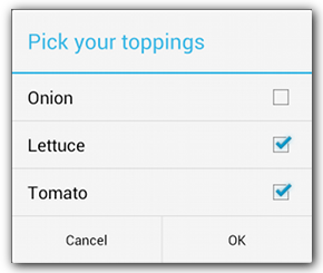 @Override public Dialog onCreateDialog(Bundle savedInstanceState) { selectedItems = new ArrayList(); // Where we track the selected items AlertDialog.Builder builder = new AlertDialog.Builder(getActivity()); // Set the dialog title. builder.setTitle(R.string.pick_toppings) // Specify the list array, the items to be selected by default (null for // none), and the listener through which to receive callbacks when items // are selected. .setMultiChoiceItems(R.array.toppings, null, new DialogInterface.OnMultiChoiceClickListener() { @Override public void onClick(DialogInterface dialog, int which, boolean isChecked) { if (isChecked) { // If the user checks the item, add it to the selected // items. selectedItems.add(which); } else if (selectedItems.contains(which)) { // If the item is already in the array, remove it. selectedItems.remove(which); } } }) // Set the action buttons .setPositiveButton(R.string.ok, new DialogInterface.OnClickListener() { @Override public void onClick(DialogInterface dialog, int id) { // User taps OK, so save the selectedItems results // somewhere or return them to the component that opens the // dialog. ... } }) .setNegativeButton(R.string.cancel, new DialogInterface.OnClickListener() { @Override public void onClick(DialogInterface dialog, int id) { ... } }); return builder.create(); }